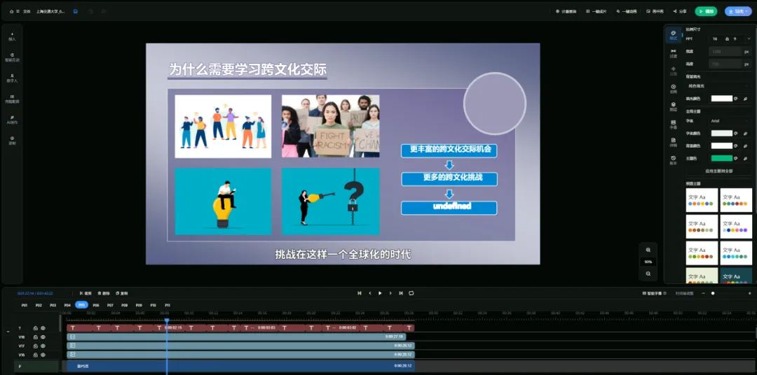 配备直观易用的时间线剪辑工具,支持视频片段的分割、拼接、变速、删除等精细化操作,同时可同步调整音频、字幕、动画的时间轴对应关系。用户无需专业剪辑技能,即可轻松优化画面节奏,精准把控知识点讲解时长,实现内容与画面的高度协同,让微课节奏更贴合教学需求。