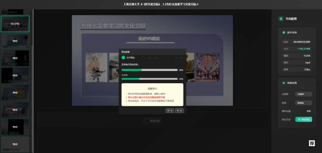 支持多种高清视频格式导出,兼容智慧大屏、在线学习平台、移动终端、投影仪等各类播放设备,同时可根据需求自定义分辨率、帧率等参数,兼顾画质呈现与文件大小。导出后的微课可直接用于课堂教学、线上点播、资源共享等场景,实现“一次创作、多端适配”。