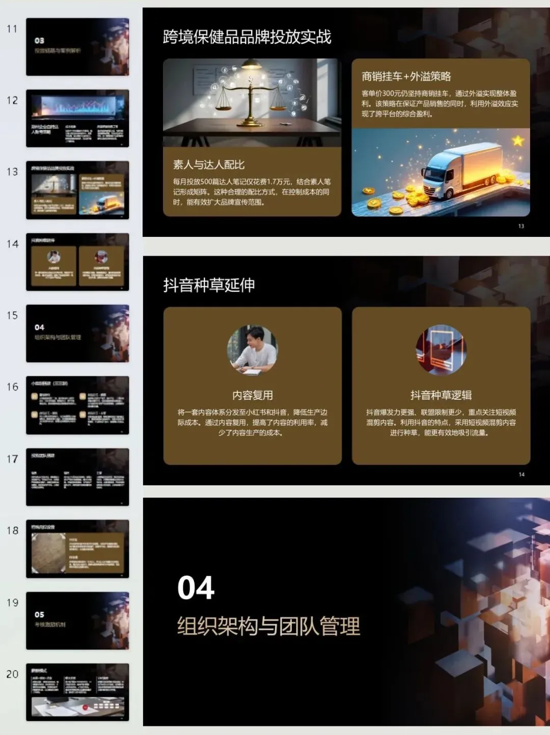●逻辑:一套内容体系多渠道分发(小红书+抖音+视频号),例:小红书“军训防晒”笔记,抖音可剪成“15秒防晒对比”短视频,视频号侧重“宝妈视角推荐”;