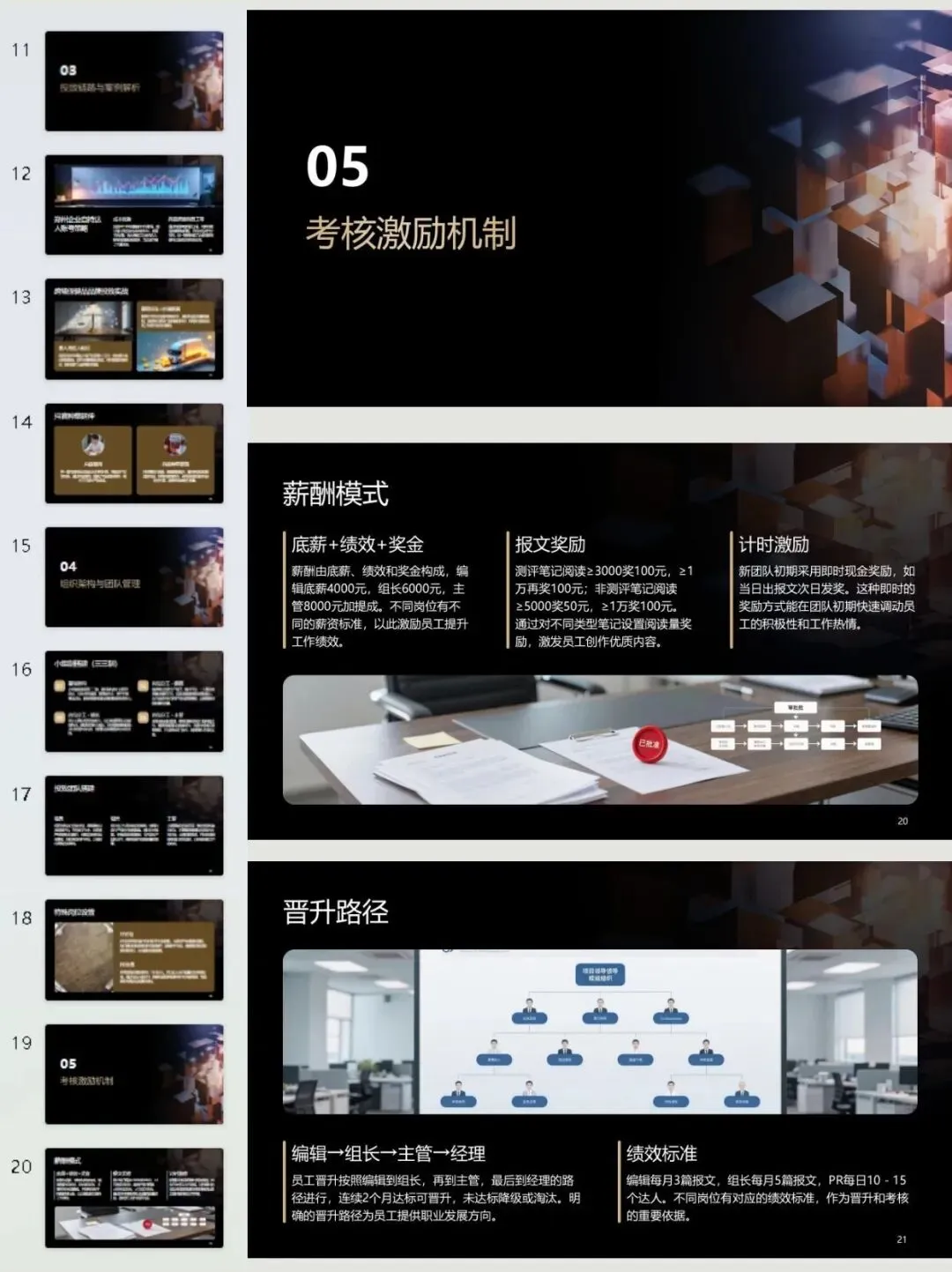 ●新团队激励:计时激励(当天出爆文,次日发现金),刺激初期动力,后期逐步过渡到“绩效+提成”。