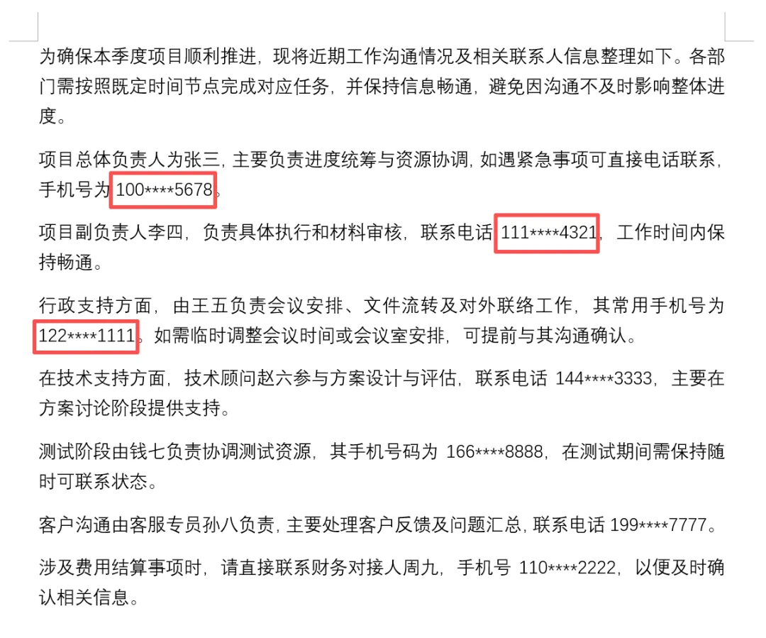 我们要将Word文件发送给第三方,或者对外发布和共享,就需要给文档中的隐私信息做打码处理。比如要将名单、统计表等发送给上级单位,上报版本必须脱敏。原始数据中的手机号要批量隐藏起来,保留姓名、部门等信息。