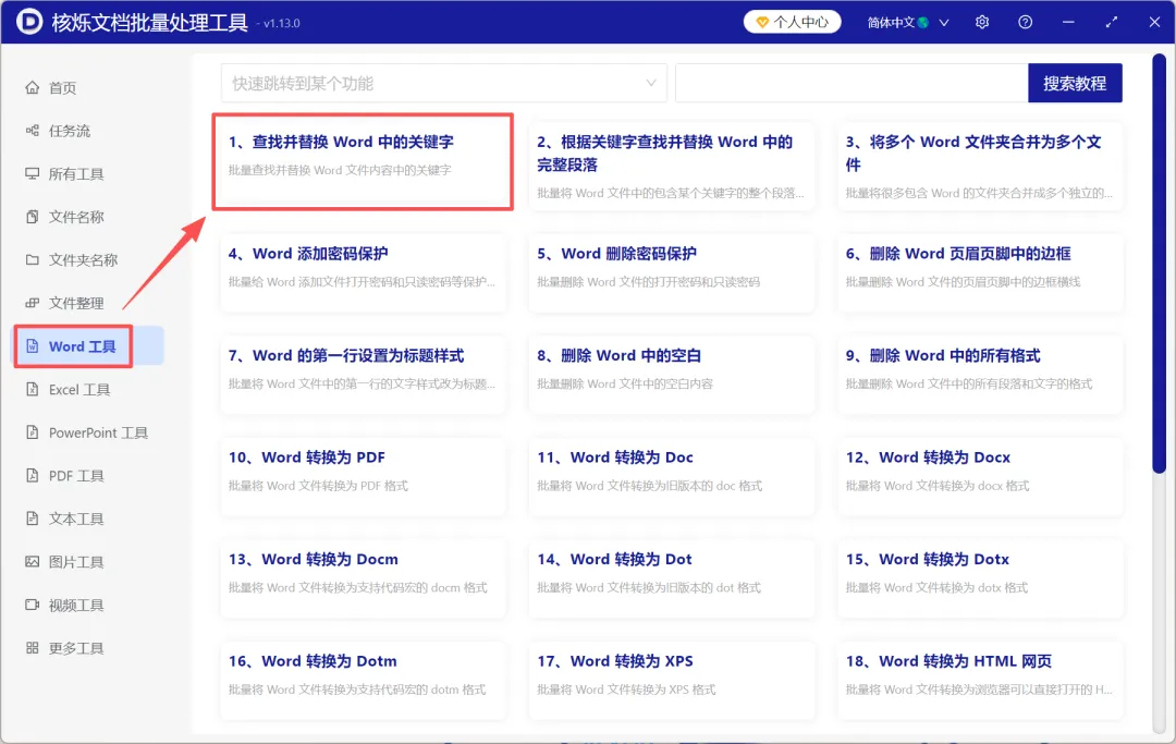 1、打开【核烁文档批量处理工具】,选择【Word工具】-【查找并替换Word中的关键字】。