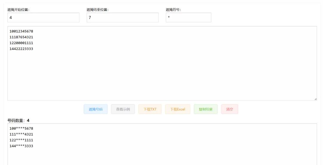 支持批量粘贴手机号码,并把所有手机号的中间4位变成星号,所有号码一键处理。