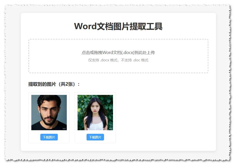 <!DOCTYPE html><htmllang="zh-CN"><head> <metacharset="UTF-8"> <metaname="viewport"content="width=device-width, initial-scale=1.0"> <title>Word文档图片提取工具</title> <style> * { margin: 0; padding: 0; box-sizing: border-box; font-family: "微软雅黑", sans-serif; } body { max-width: 800px; margin: 50px auto; padding: 20px; background-color: #f5f5f5; } .container { background: white; padding: 30px; border-radius: 8px; box-shadow: 0 2px 10px rgba(0,0,0,0.1); } h1 { text-align: center; color: #333; margin-bottom: 30px; } .upload-area { border: 2px dashed #ccc; border-radius: 6px; padding: 40px 20px; text-align: center; cursor: pointer; transition: all 0.3s; margin-bottom: 30px; } .upload-area:hover { border-color: #409eff; background-color: #f8f9fa; } .upload-area.active { border-color: #67c23a; background-color: #f0f9eb; } #fileInput { display: none; } .upload-text { color: #666; font-size: 16px; } .tip { color: #999; font-size: 14px; margin-top: 10px; } #previewArea { margin-top: 30px; display: none; } #previewArea h2 { color: #333; margin-bottom: 20px; font-size: 18px; } .image-list { display: grid; grid-template-columns: repeat(auto-fill, minmax(150px, 1fr)); gap: 20px; } .image-item { border: 1px solid #eee; border-radius: 4px; padding: 10px; text-align: center; } .image-item img { max-width: 100%; max-height: 150px; object-fit: contain; margin-bottom: 10px; cursor: zoom-in; } .image-item button { background-color: #409eff; color: white; border: none; padding: 5px 10px; border-radius: 4px; cursor: pointer; font-size: 12px; } .image-item button:hover { background-color: #337ecc; } #status { text-align: center; margin-top: 20px; color: #666; font-size: 16px; } .error { color: #f56c6c !important; } .success { color: #67c23a !important; } </style></head><body> <divclass="container"> <h1>Word文档图片提取工具</h1> <!-- 上传区域 --> <divclass="upload-area"id="uploadArea"> <inputtype="file"id="fileInput"accept=".docx"> <divclass="upload-text"> 点击或拖拽Word文档(.docx)到此处上传 </div> <divclass="tip"> 仅支持 .docx 格式,不支持 .doc 格式 </div> </div> <!-- 状态提示 --> <divid="status"></div> <!-- 图片预览区域 --> <divid="previewArea"> <h2>提取到的图片(共<spanid="imageCount">0</span>张):</h2> <divclass="image-list"id="imageList"></div> </div> </div> <!-- 引入jszip库 --> <scriptsrc="https://cdn.jsdelivr.net/npm/jszip@3.10.1/dist/jszip.min.js"></script> <script> // 获取DOM元素 const uploadArea = document.getElementById('uploadArea'); const fileInput = document.getElementById('fileInput'); const status = document.getElementById('status'); const previewArea = document.getElementById('previewArea'); const imageList = document.getElementById('imageList'); const imageCount = document.getElementById('imageCount'); // 点击上传区域触发文件选择 uploadArea.addEventListener('click', () => { fileInput.click(); }); // 拖拽文件处理 uploadArea.addEventListener('dragover', (e) => { e.preventDefault(); uploadArea.classList.add('active'); }); uploadArea.addEventListener('dragleave', () => { uploadArea.classList.remove('active'); }); uploadArea.addEventListener('drop', (e) => { e.preventDefault(); uploadArea.classList.remove('active'); if (e.dataTransfer.files.length > 0) { handleFile(e.dataTransfer.files[0]); } }); // 文件选择后处理 fileInput.addEventListener('change', () => { if (fileInput.files.length > 0) { handleFile(fileInput.files[0]); } }); /** * 处理上传的Word文件 * @param {File} file 上传的文件对象 */ async function handleFile(file) { // 验证文件格式 if (!file.name.endsWith('.docx')) { showStatus('请上传 .docx 格式的Word文档!', 'error'); return; } showStatus('正在解析文档并提取图片,请稍候...'); try { // 读取文件内容 const arrayBuffer = await readFileAsArrayBuffer(file); // 解析ZIP包(docx本质是zip压缩包) const zip = await JSZip.loadAsync(arrayBuffer); // 存储提取到的图片 const images = []; // 遍历zip中的所有文件,筛选图片(Word中的图片通常在word/media/目录下) zip.forEach(async (relativePath, zipEntry) => { // 匹配word/media/目录下的图片文件 if (relativePath.startsWith('word/media/') && !zipEntry.dir) { const fileName = zipEntry.name.split('/').pop(); // 获取图片的MIME类型 const mimeType = getMimeTypeByFileName(fileName); if (mimeType) { // 读取图片内容 const content = await zipEntry.async('blob'); // 创建图片URL const imageUrl = URL.createObjectURL(content); images.push({ name: fileName, url: imageUrl, blob: content, mimeType: mimeType }); } } }); // 等待所有图片解析完成(延迟确保遍历完成) setTimeout(() => { if (images.length === 0) { showStatus('未在文档中找到任何图片!', 'error'); return; } // 显示提取结果 showStatus(`成功提取到 ${images.length} 张图片!`, 'success'); showImages(images); }, 500); } catch (error) { console.error('提取图片失败:', error); showStatus('提取图片失败,请检查文档是否损坏或格式正确!', 'error'); } } /** * 根据文件名获取MIME类型 * @param {string} fileName 文件名 * @returns {string} MIME类型 */ function getMimeTypeByFileName(fileName) { const ext = fileName.split('.').pop().toLowerCase(); const mimeMap = { 'png': 'image/png', 'jpg': 'image/jpeg', 'jpeg': 'image/jpeg', 'gif': 'image/gif', 'bmp': 'image/bmp', 'svg': 'image/svg+xml' }; return mimeMap[ext] || null; } /** * 显示提取到的图片 * @param {Array} images 图片数组 */ function showImages(images) { // 清空图片列表 imageList.innerHTML = ''; // 更新图片数量 imageCount.textContent = images.length; // 显示预览区域 previewArea.style.display = 'block'; // 遍历图片创建预览项 images.forEach((image, index) => { const imageItem = document.createElement('div'); imageItem.className = 'image-item'; // 图片预览 const img = document.createElement('img'); img.src = image.url; img.alt = `图片${index + 1}`; img.title = '点