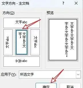 2、进入到文字方向界面后,在页面中选择【竖排】后查看预览效果并点击确定。