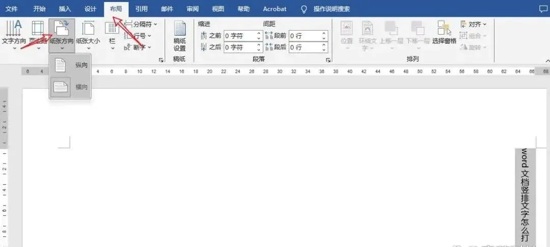 3、文字方向成功调整为竖排,同时纸张方向也调整为横向,在功能区的方向中找到纸张方向选择【纵向】。