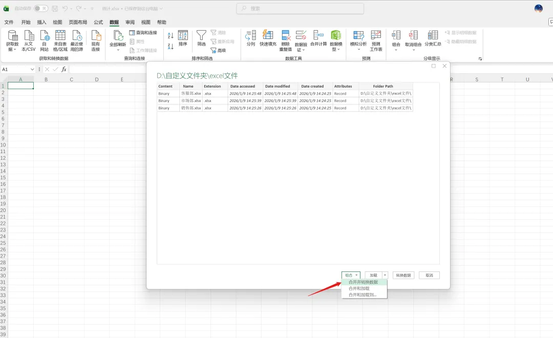合并和加载:直接将合并后的数据加载到当前 Excel 工作表,不会进入编辑器