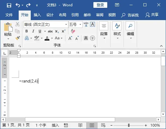 在空白文档的段落起始位置输入公式“=rand(2,4)”。2.查看输入的虚拟内容。