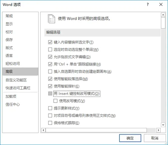 打开【Word 选项】对话框,选择【高级】选项卡,在【编辑选项】栏中取消选中【用 Insert 键控制改写模式】复选框,然后单击【确定】按钮即可。