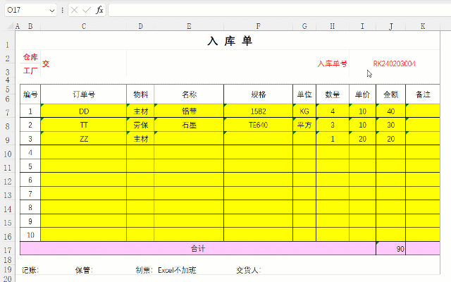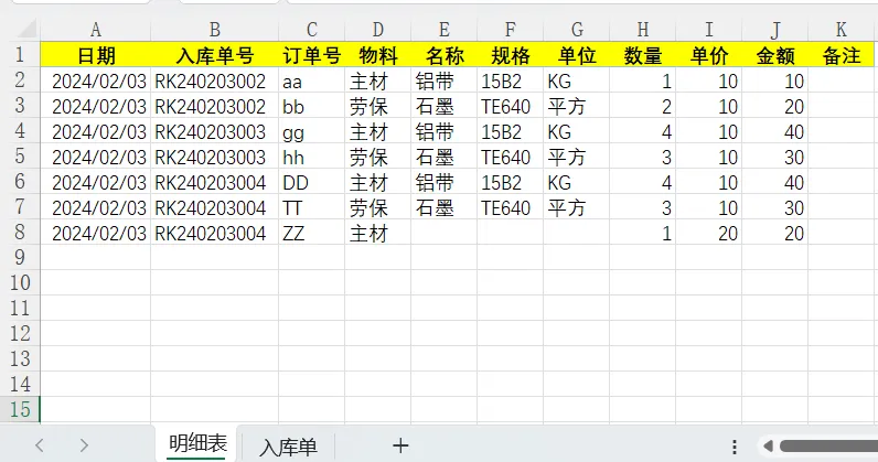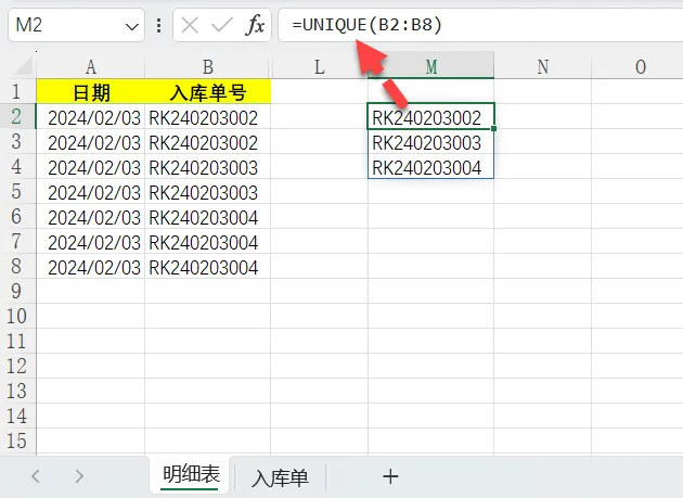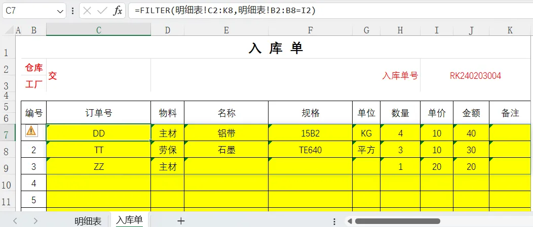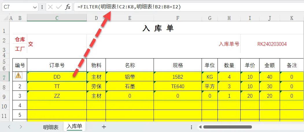 当然,这里的入库单号,也可以根据明细表用公式提取不重复。