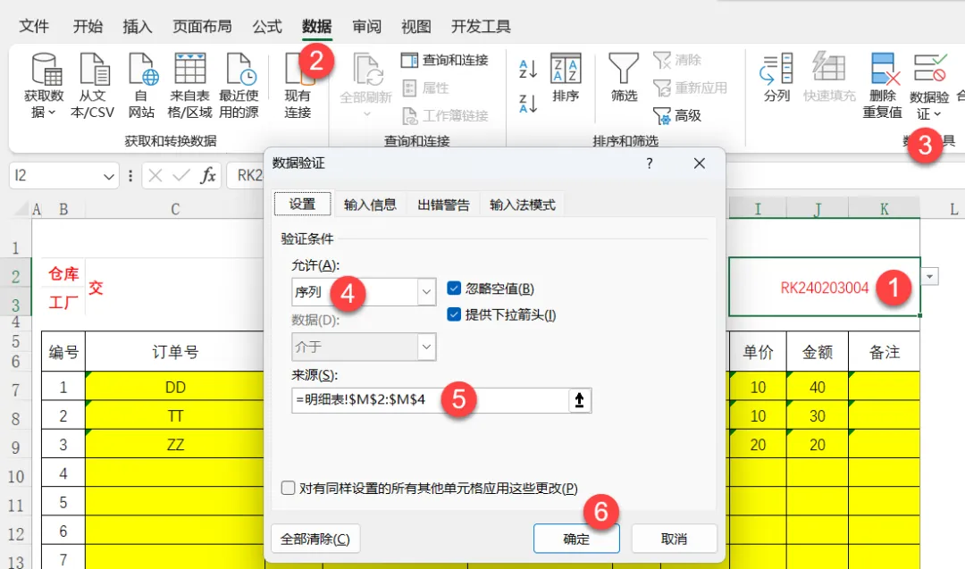 再制作一个下拉菜单,可以选择入库单号。选择I2单元格,点数据,数据验证,序列,来源引用提取不重复后的区域,确定。