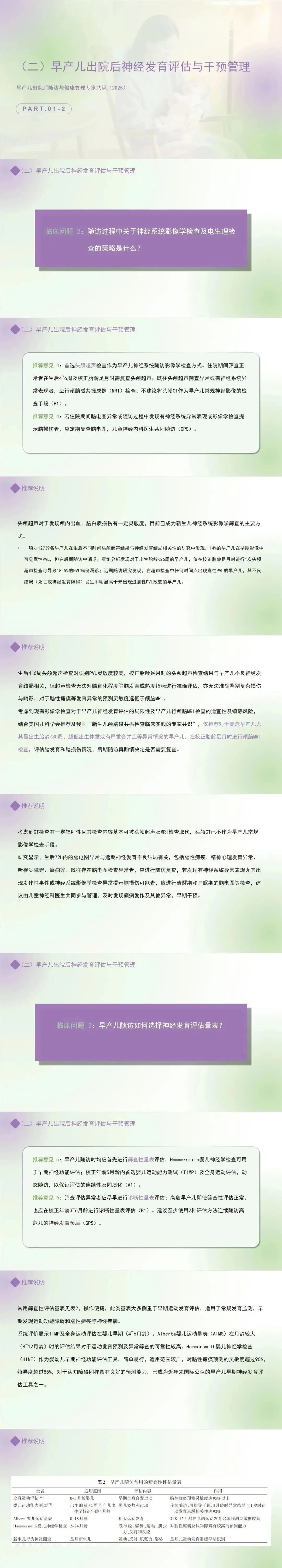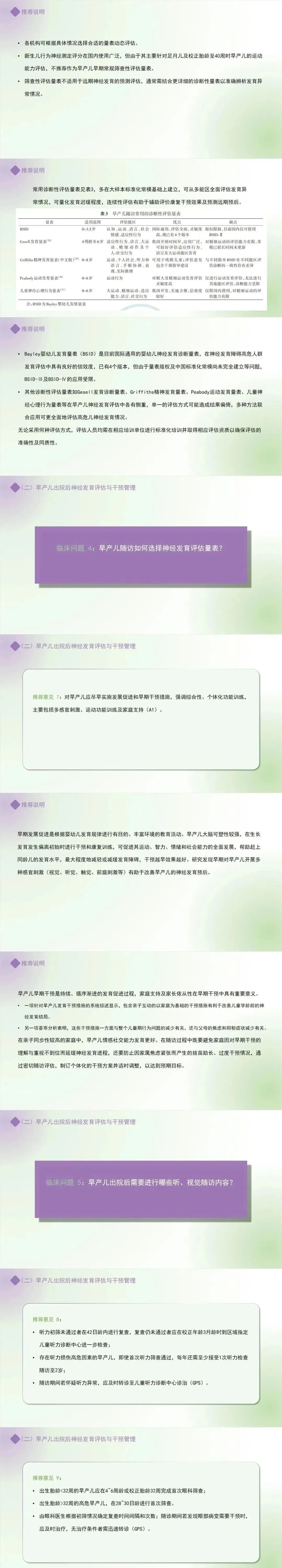 推荐意见 6:筛查评估异常者应尽早进行诊断性量表评估;高危早产儿即使筛查性评估正常,也应在校正年龄3~6月龄进行诊断性量表评估。建议至少使用2种评估方法连续随访高危儿的神经发育预后。