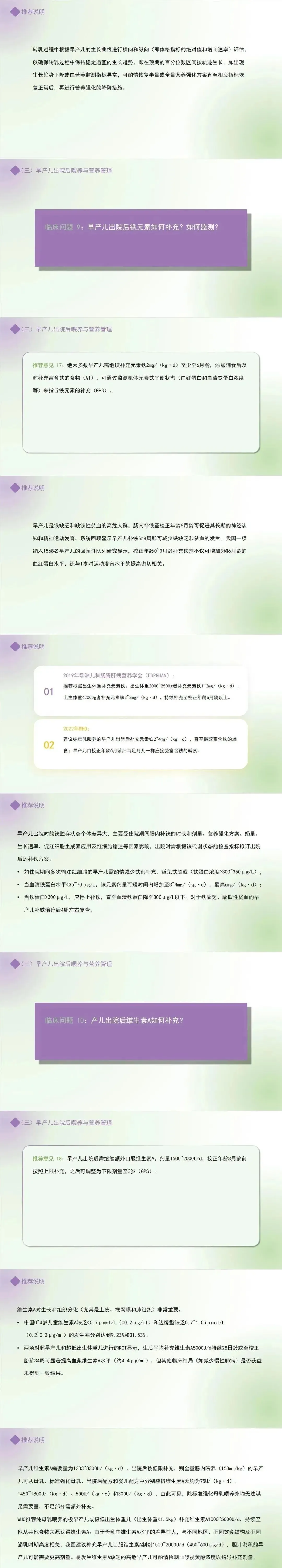 推荐意见 17:绝大多数早产儿需继续补充元素铁2mg/(kg·d)至少至6月龄,添加辅食后及时补充富含铁的食物(A1),可通过监测机体元素铁平衡状态(血红蛋白和血清铁蛋白浓度等)来指导铁元素的补充。