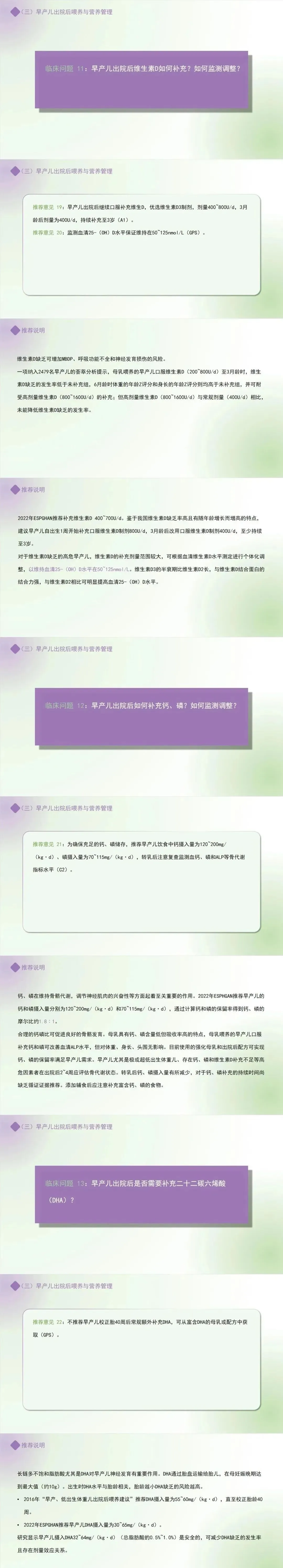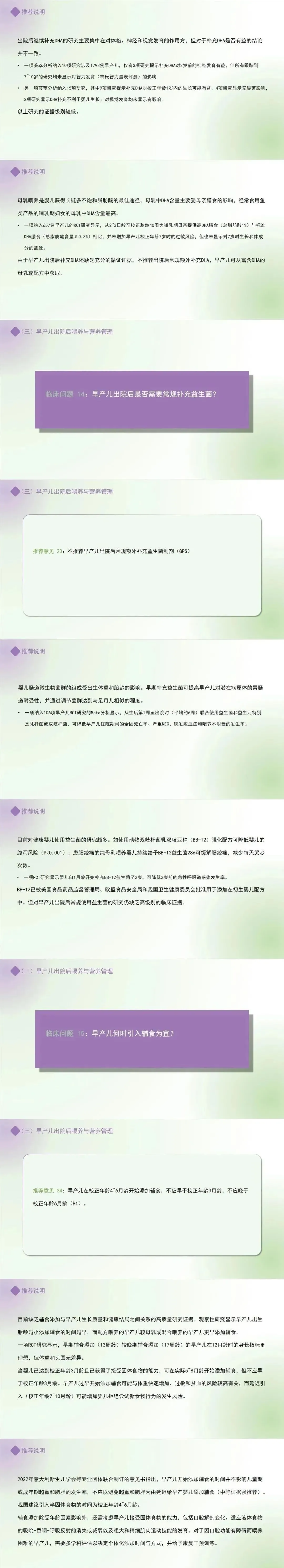 推荐意见 22:不推荐早产儿校正胎40周后常规额外补充DHA,可从富含DHA的母乳或配方中获取。