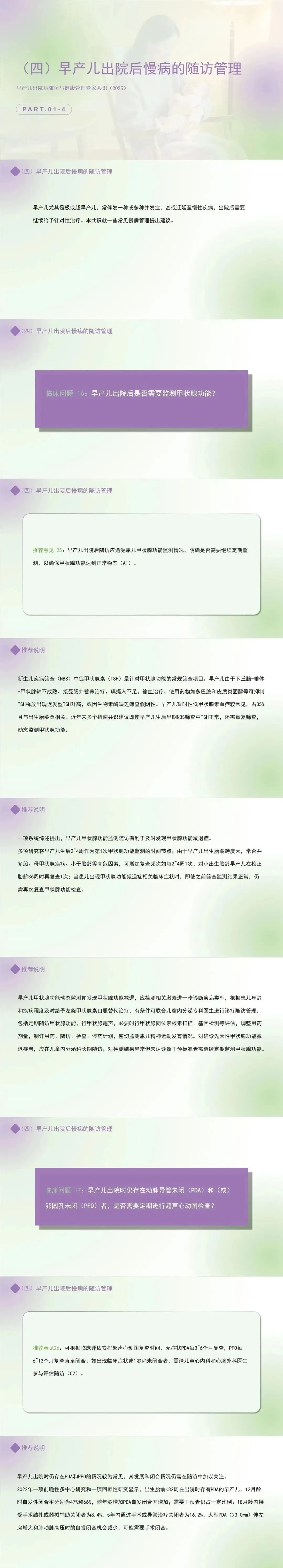 推荐意见26:可根据临床评估安排超声心动图复查时间,无症状PDA每3~6个月复查,PFO每6~12个月复查直至闭合;如出现临床症状或1岁尚未闭合者,需请儿童心内科和心胸外科医生参与评估随访。