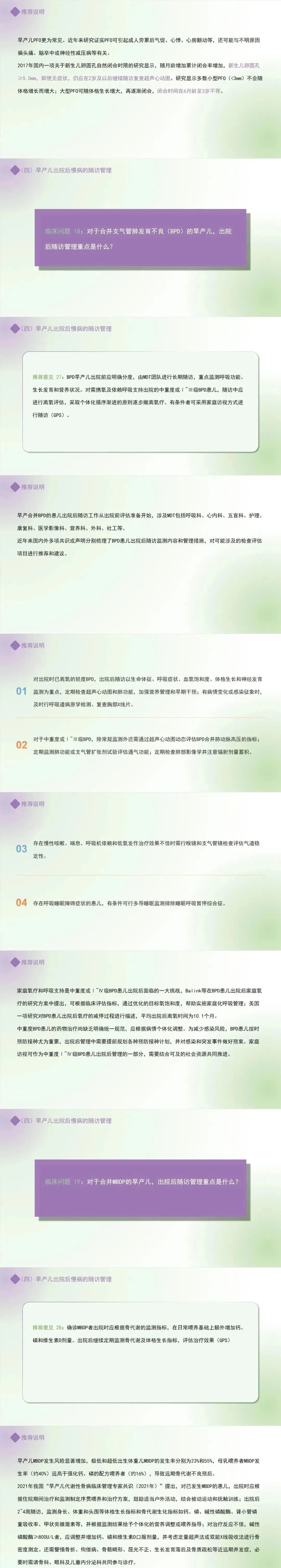 推荐意见 27:BPD早产儿出院前应明确分度,由MDT团队进行长期随访,重点监测呼吸功能、生长发育和营养状况。对需携氧及依赖呼吸支持出院的中重度或Ⅰ~Ⅲ级BPD患儿,随访中应进行离氧评估,采取个体化循序渐进的原则逐步撤离氧疗。有条件者可采用家庭访视方式进行随访。