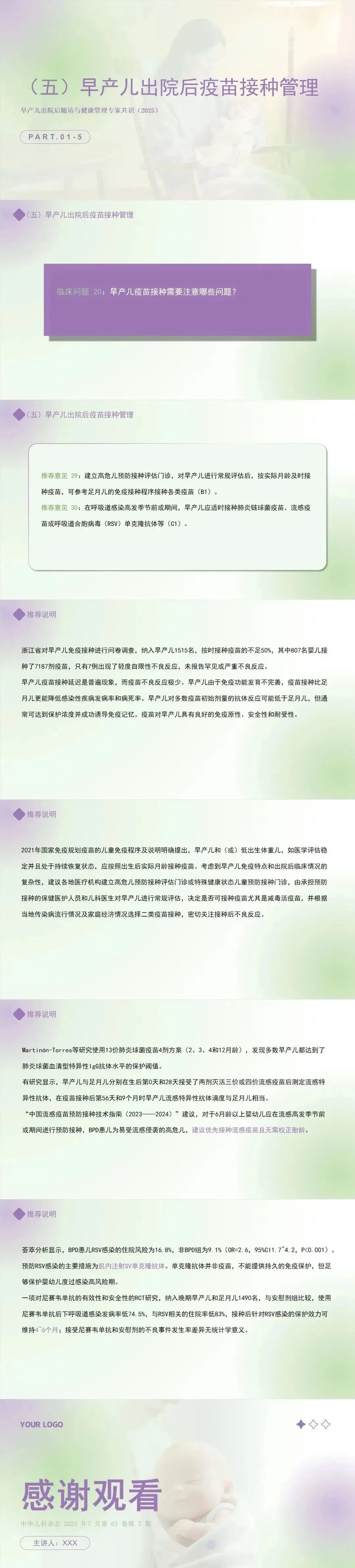 推荐意见 30:在呼吸道感染高发季节前或期间,早产儿应适时接种肺炎链球菌疫苗、流感疫苗或呼吸道合胞病毒(RSV)单克隆抗体等。