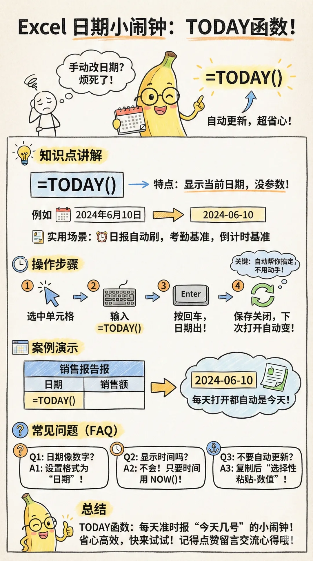 总结内容:TODAY函数就是你的日期“小闹钟”,每天帮你准时报“今天几号”,省去手动敲日期的烦恼。职场中不妨试试看,保证让你的Excel表格更智能,还能提升效率!如果你也被日期困扰过,快点赞、留言告诉我你的使用心得,或者询问你的日期难题吧。我们下期见,祝你每日好心情,日期自动到!