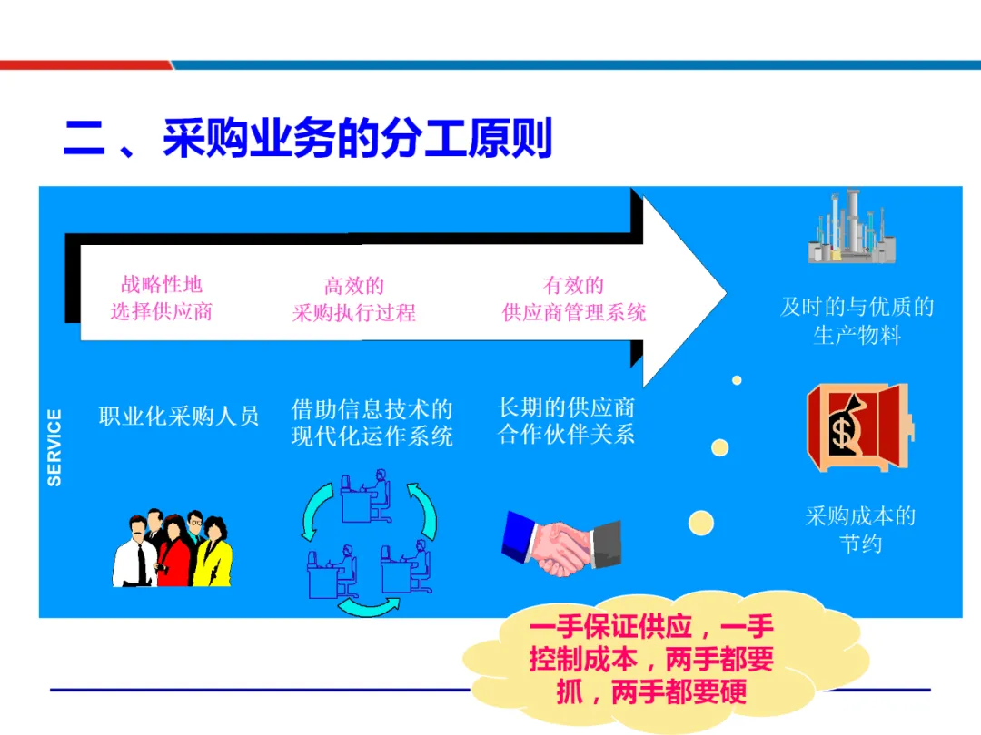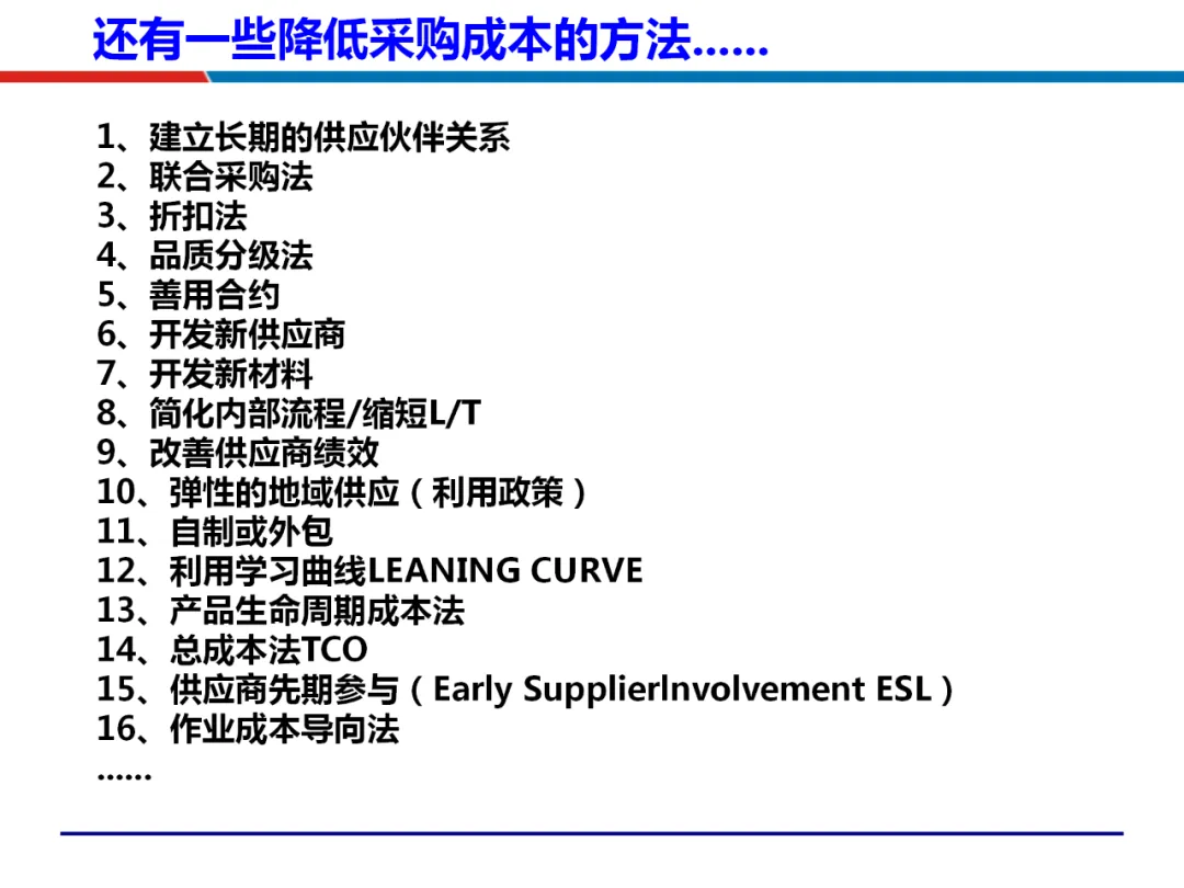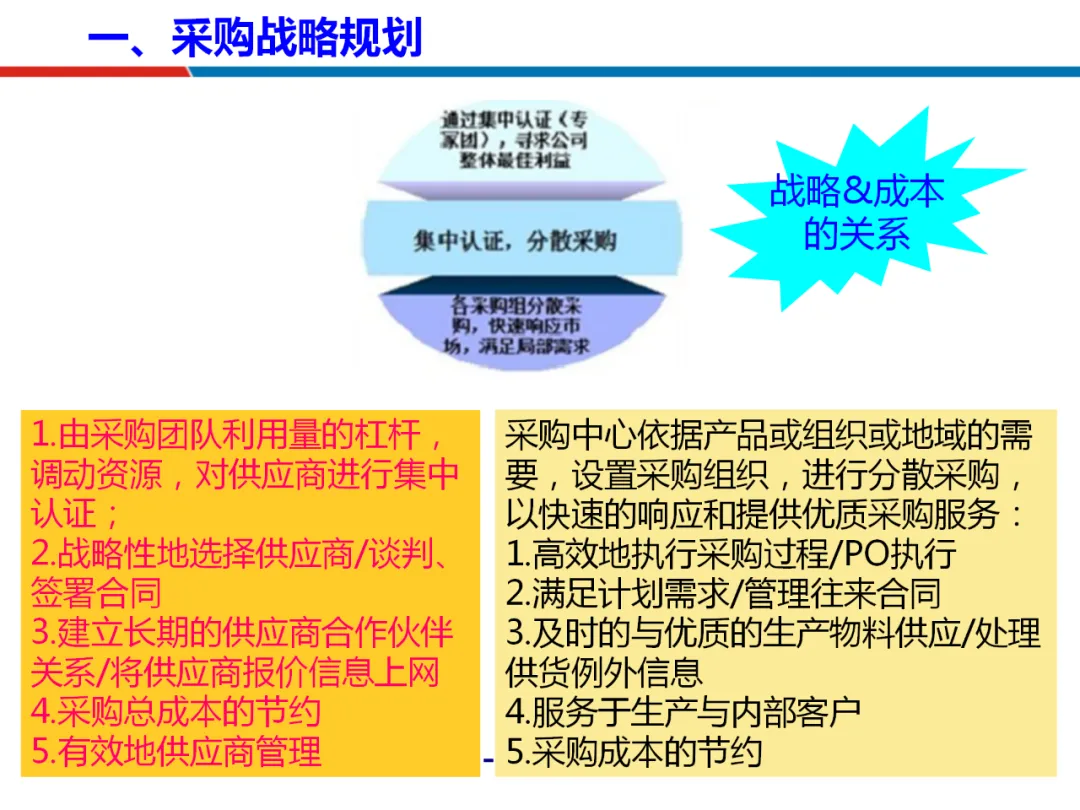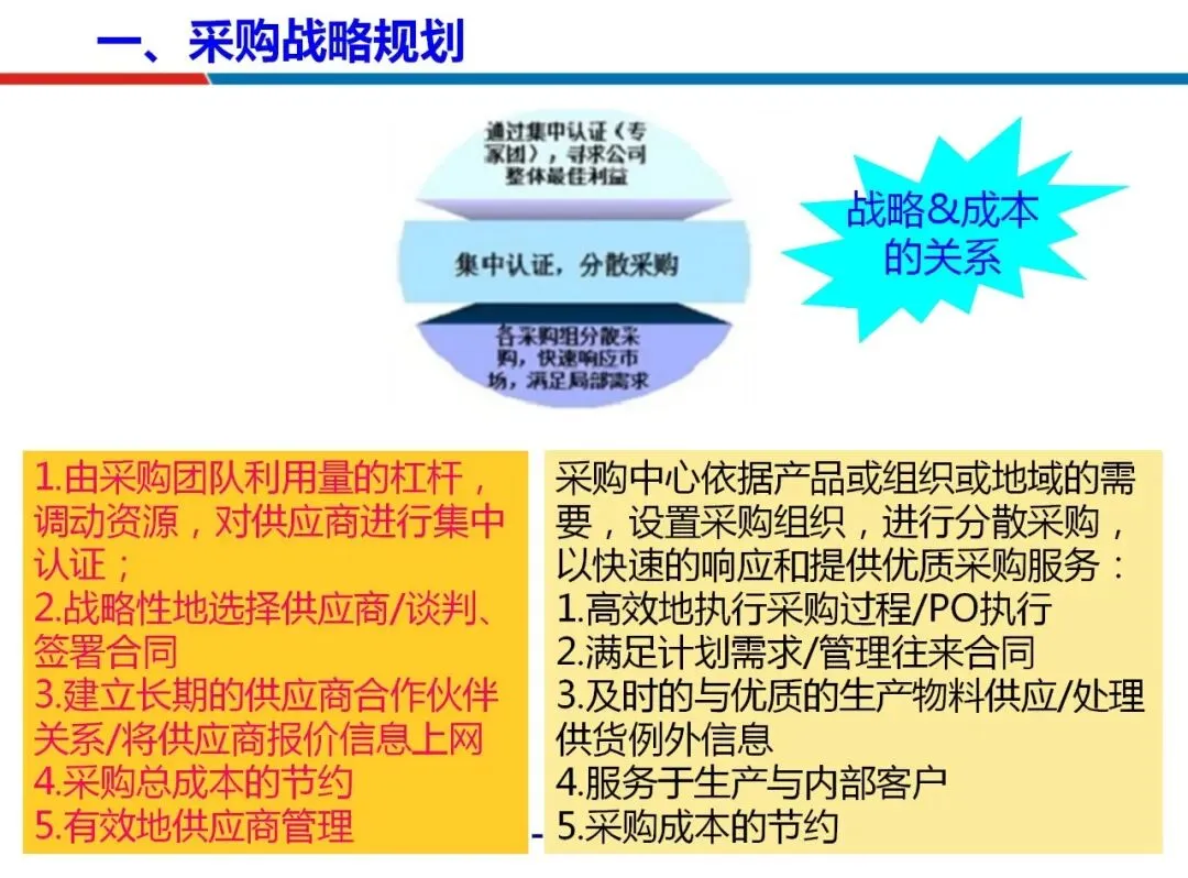 战略层面,采购需与企业整体战略对齐,制定差异化的采购策略。依据物资重要性分类,采取成本管理、风险管控等不同战术组合。这要求采购从执行角色转向战略规划者,通过供应商关系管理和价值分析,从源头塑造成本优势,为谈判积累筹码。