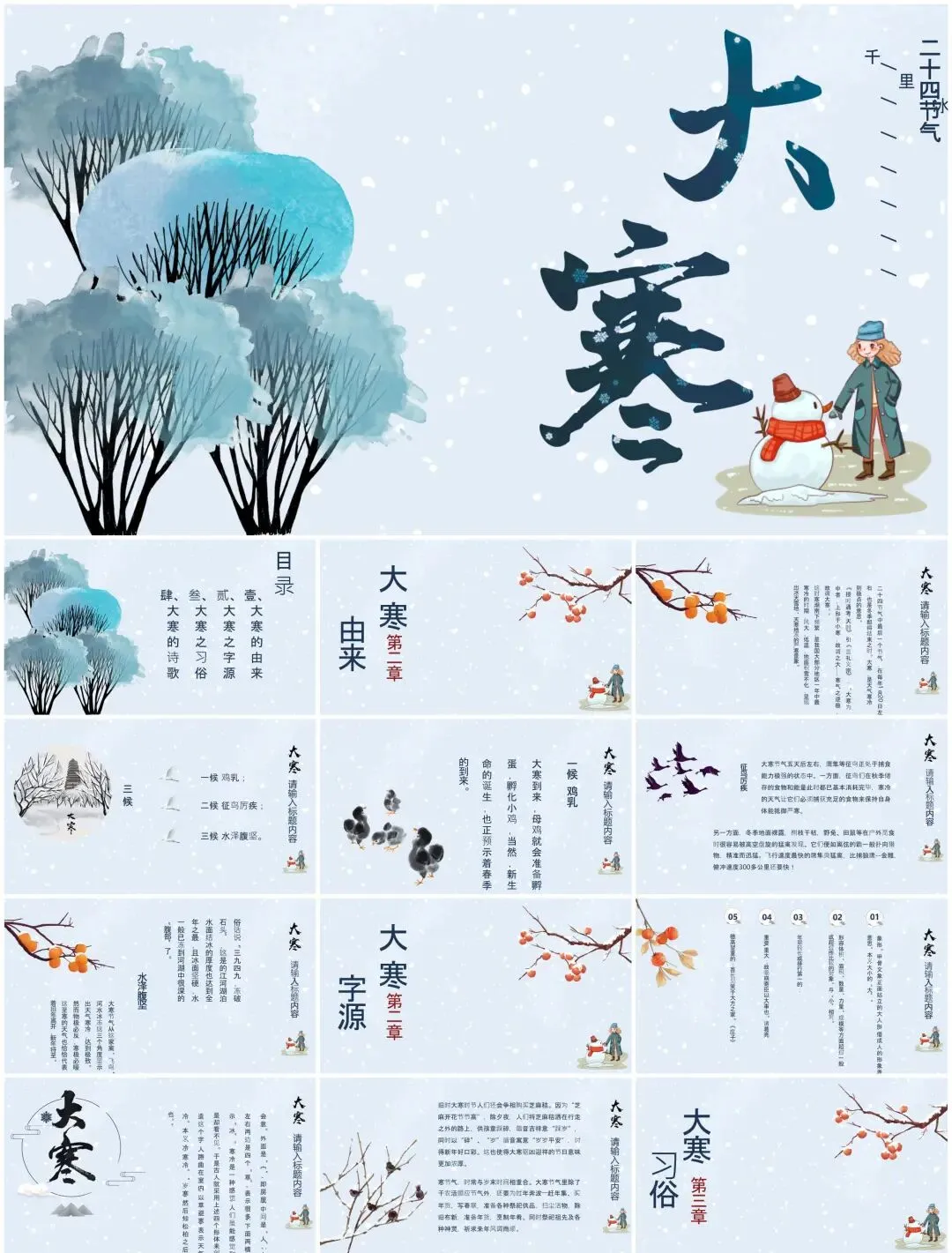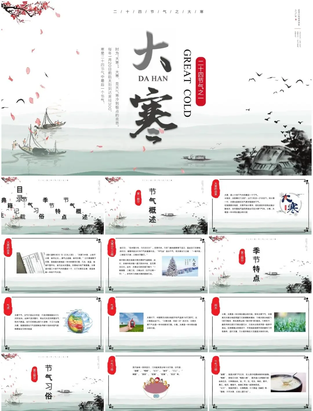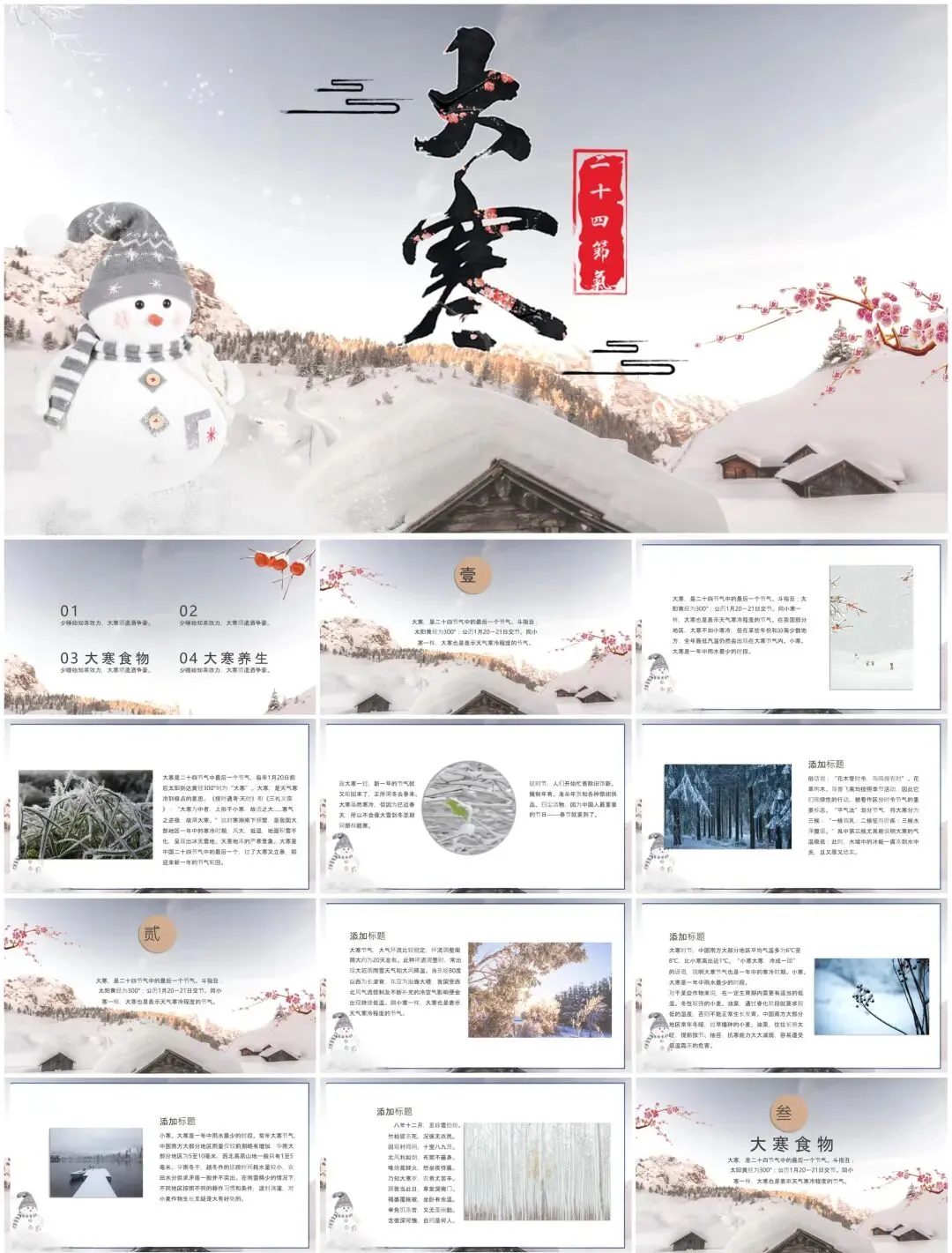 从"雪压松枝"动态封面到腊八民俗图解,从冬藏养生知识图谱到年货节数据看板——这套【节气专属PPT】融合故宫藏品元素与现代扁平化设计,用可编辑的冰雪粒子特效传递岁末温情。