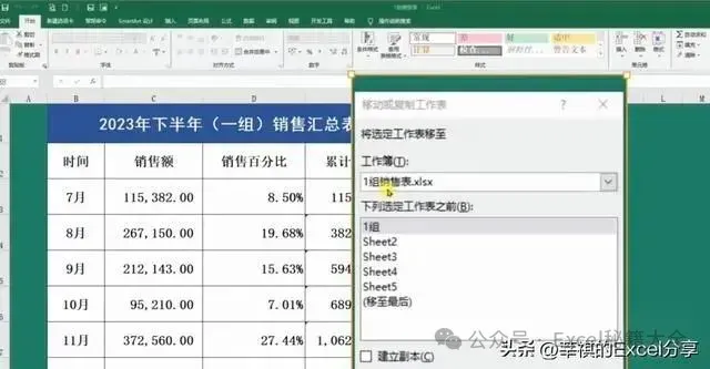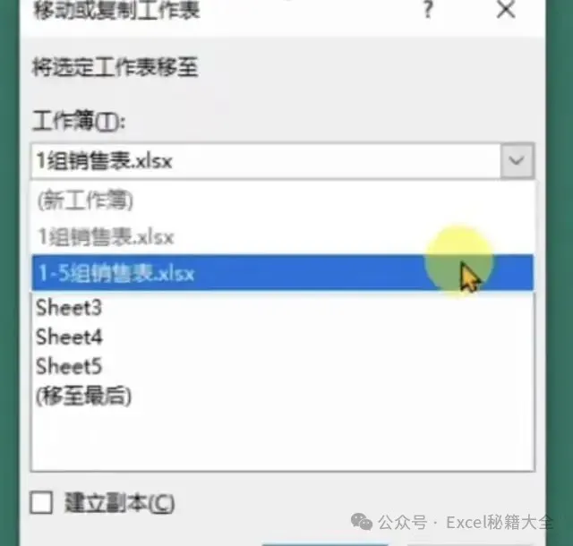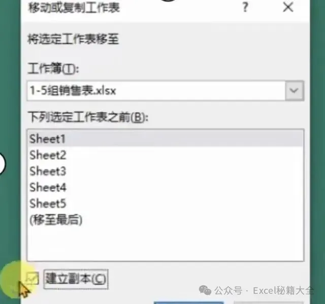 咱们选择1组至5组销售表,然后,咱们看下面的选项(参看图5),咱们点击”sheet1”,意思就是将工作表移动到1组至5组销售表中的”sheet1”,工作表的前面。