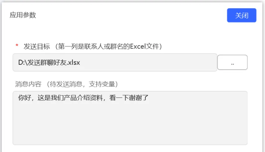 然后设置其他参数。发送目标选择要发的表格,表格里有好友名称。如果是发群就用群名称表格。有工具可以快速导出,不需要动手整理。消息内容,输入要发的文字内容,例如是文件资料的引导查看语。间隔时间设置0或者其他数字就行了。