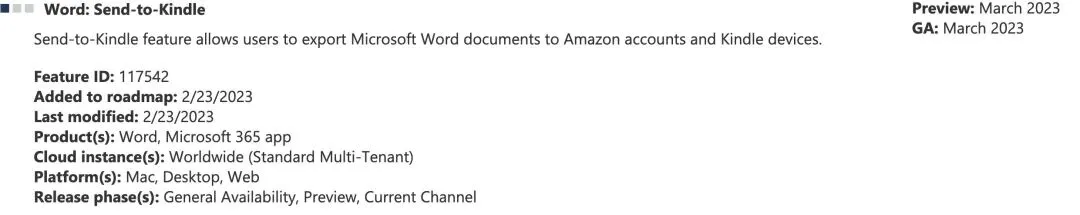 微软近日更新其官方支持文档,确认将于 2026 年 2 月 9 日正式停用 Microsoft Word 中的“发送至 Kindle”功能。该功能自 2023 年推出以来,允许用户直接从 Word(Windows、macOS 及网页版)将 .doc 或 .docx 文档发送至 Kindle 设备或阅读应用。