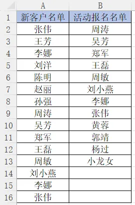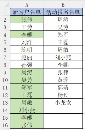 问题:A列有15个新客户名单,B列有12个活动报名名单。老板随口一问:‘咱们哪些客户既买了东西又参加了活动?你帮我标出来看看。’”
