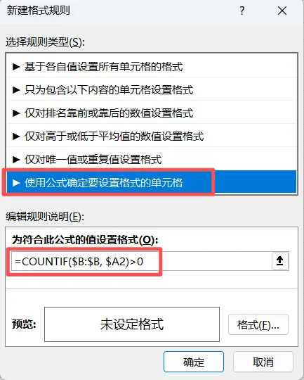$A2:这是当前正在评判的姓名。注意,列号A前有$锁定,行号2前没有$。这表示规则会依次应用到我们选中的A列每一行:评判A3时,公式会自动变成=COUNTIF($B:$B, $A3)>0,非常智能。