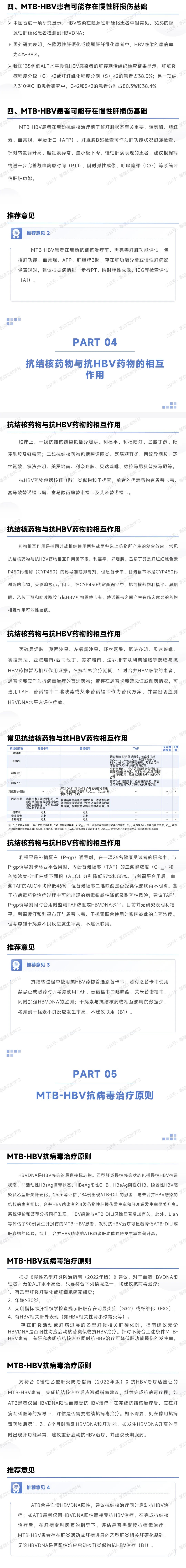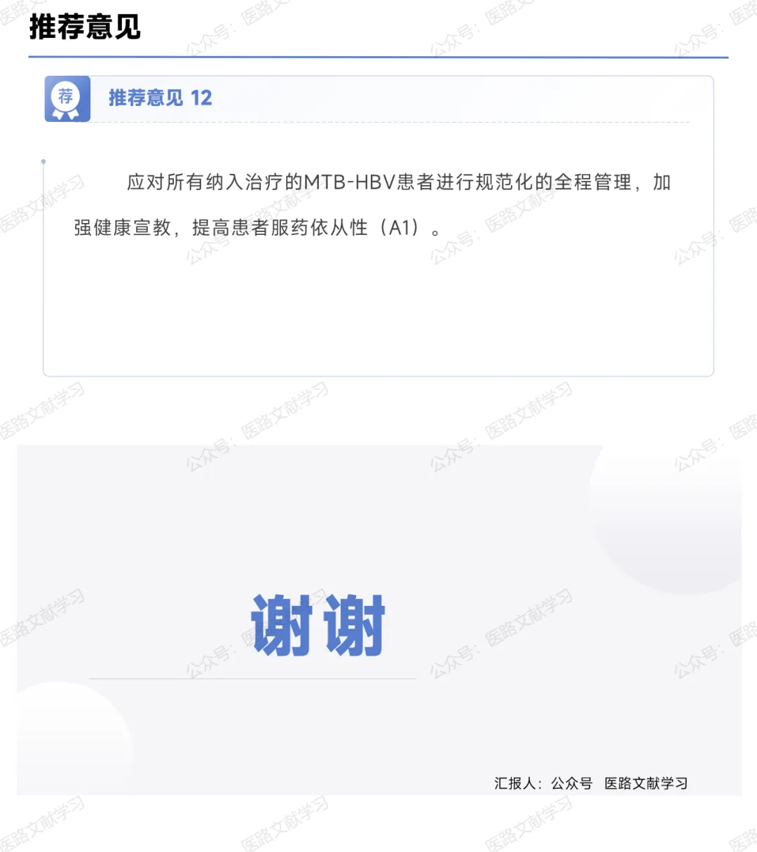 应对所有纳入治疗的 MTB-HBV 患者进行规范化的全程管理,加强健康宣教,提高患者服药依从性(A1)。