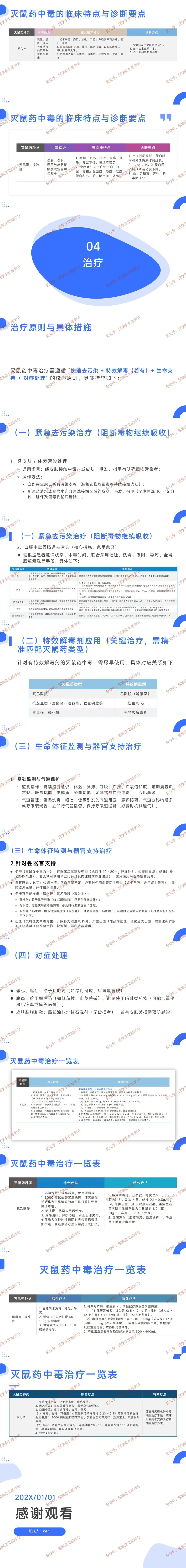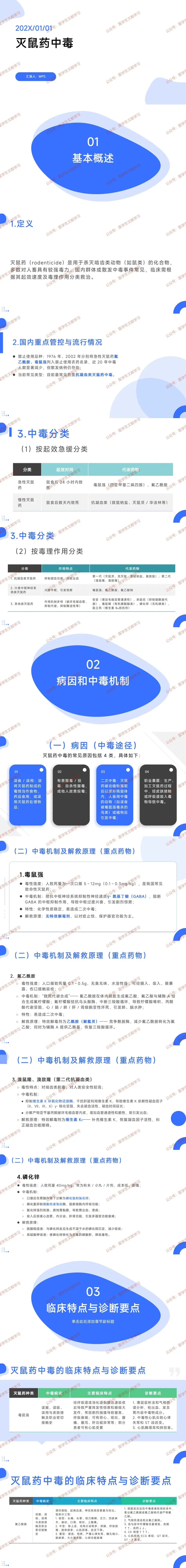 - 定义:灭鼠药是杀灭啮齿类动物的化合物,多数对人畜毒力强,国内群体或散发中毒事件常见,需按起效速度及毒理作用分类救治。