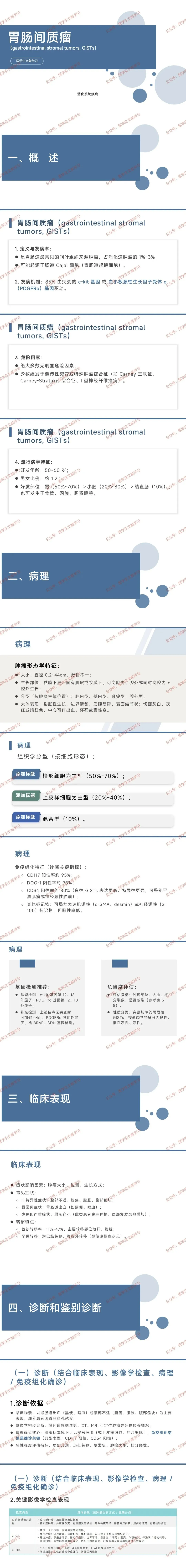 - 流行病学特征:好发年龄 50-60 岁,男女比例约 1.2:1;好发部位依次为胃(50%-70%)、小肠(20%-30%)、结直肠(10%),也可发生于食管、网膜、肠系膜等。