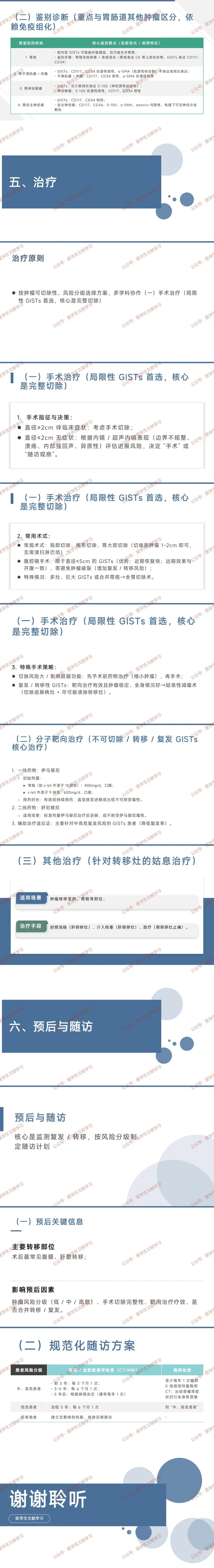 - 诊断依据:临床线索(以胃肠道出血或腹部不适为主要表现,部分因胃肠穿孔就诊);影像学初步诊断(消化道钡剂造影、CT、MRI 定位肿瘤并评估转移);病理确诊核心(组织标本镜下见梭形 / 上皮样 / 混合细胞,免疫组化典型表型:CD117 阳性、CD34 阳性);恶性程度评估(参考局部浸润、远处转移、复发史、肿瘤大小、核分裂数)。