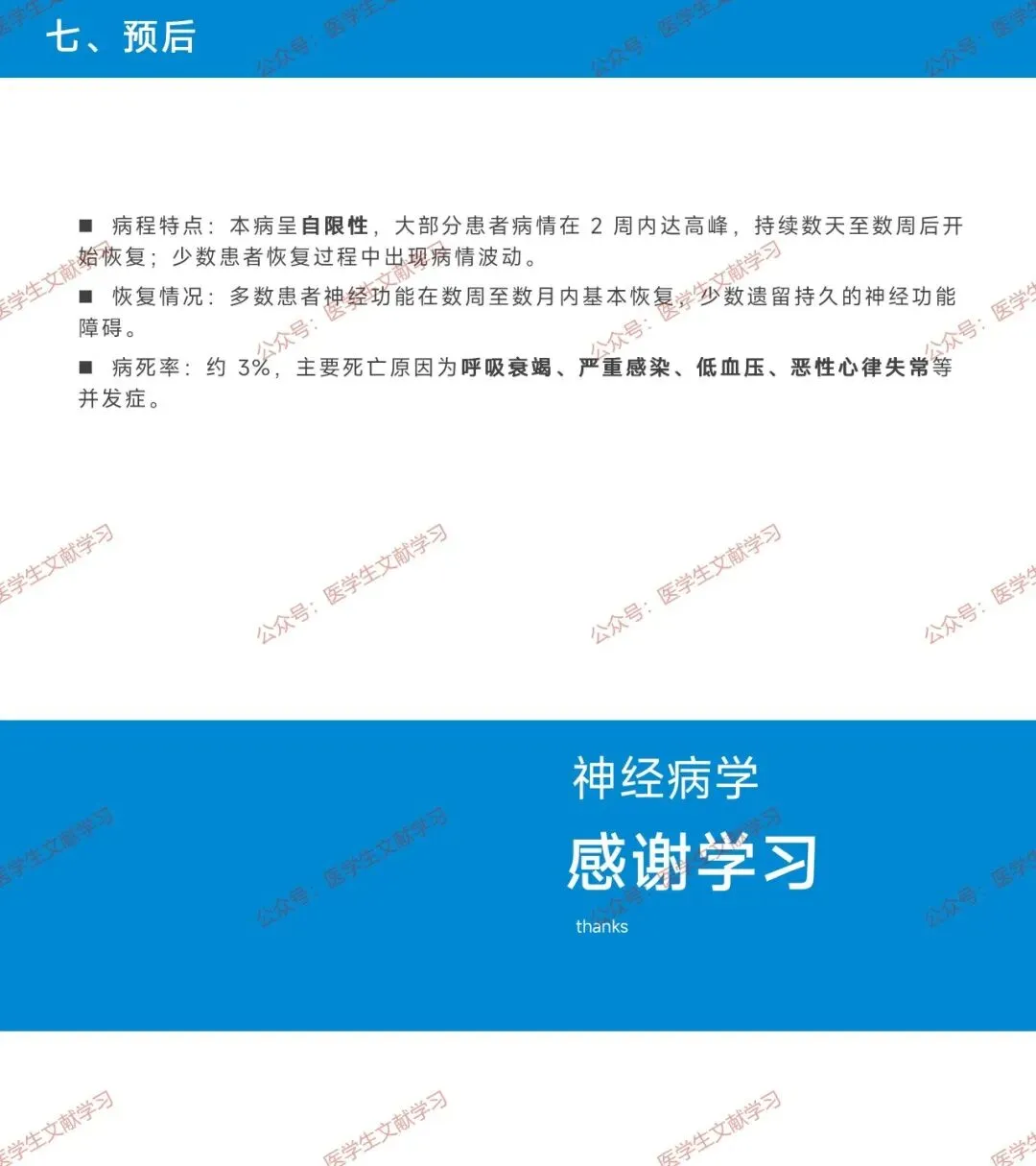 - 病程特点:自限性,多数患者 2 周内病情达高峰,数周至数月内逐渐恢复。