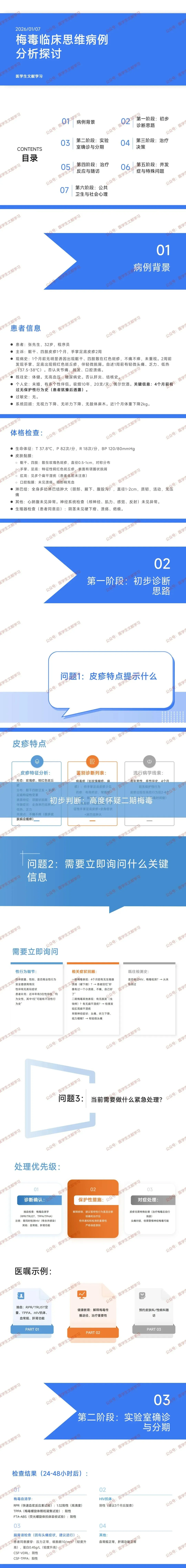 本病例为 32 岁男性二期梅毒患者,核心因无保护性行为感染,表现为特征性掌跖皮疹、全身淋巴结肿大及低热,诊疗遵循 “初步怀疑 - 实验室确诊 - 分期治疗 - 随访监测” 逻辑,青霉素为首选药物,同时需重视性伴管理与公共卫生防控。
