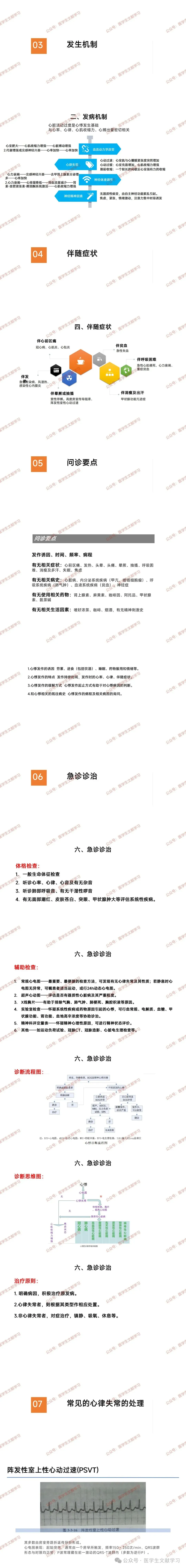 - 对症治疗:心律失常按类型处置,非心律失常者予镇静、吸氧、休息。