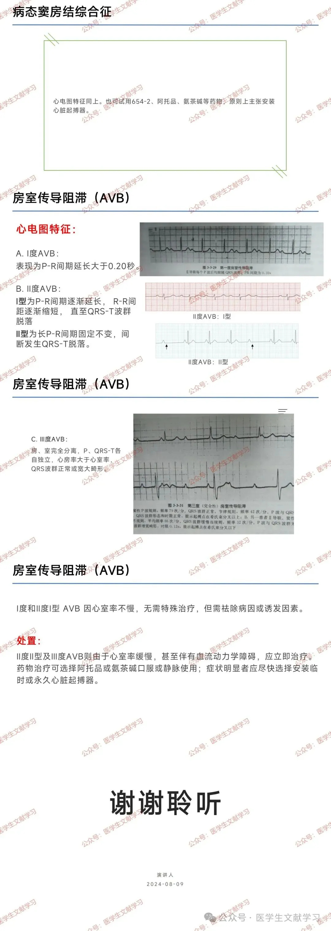 - 治疗:心率>50 次 / 分无需处理;<50 次 / 分或有症状者,用阿托品、氨茶碱,必要时心脏起搏治疗(Ⅱ 度 Ⅱ 型及 Ⅲ 度房室传导阻滞首选)。