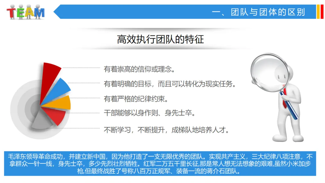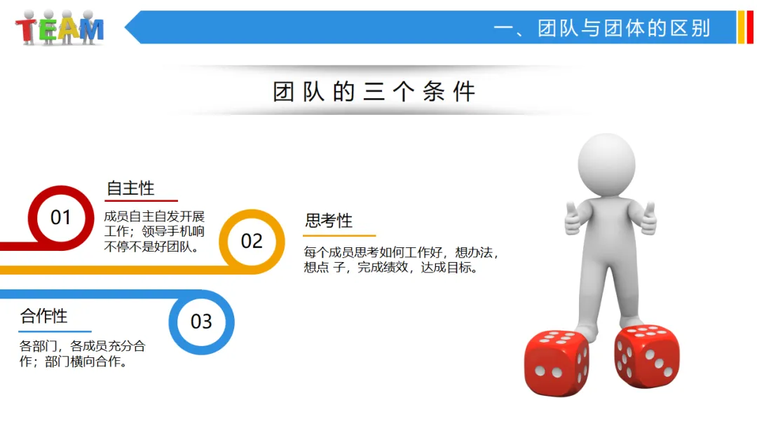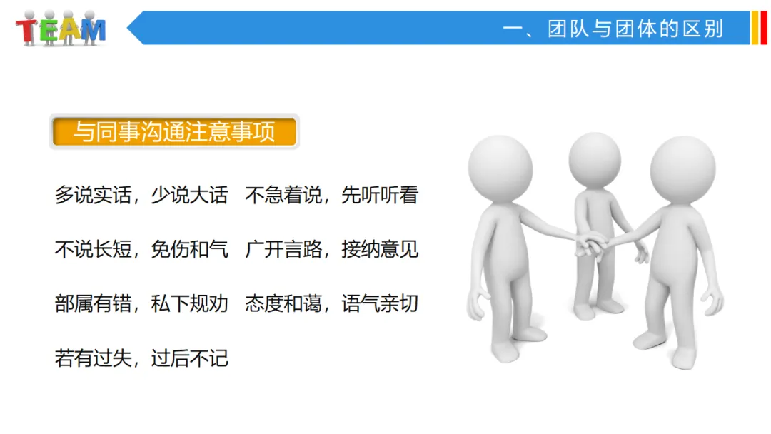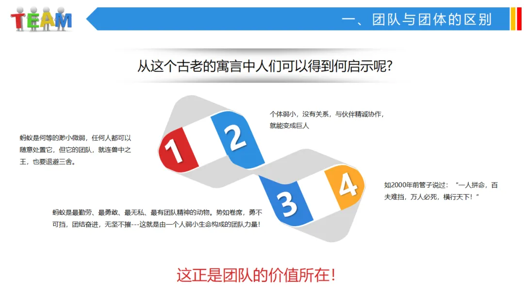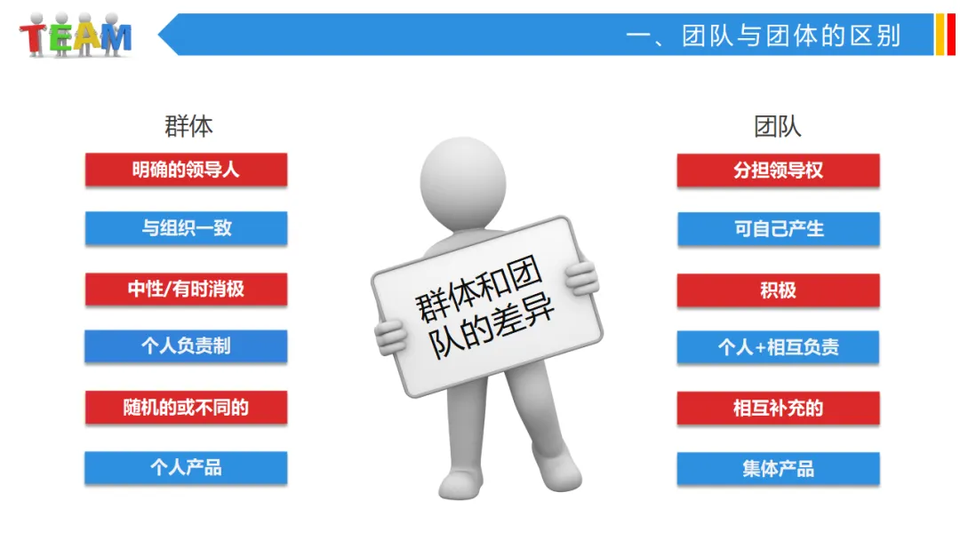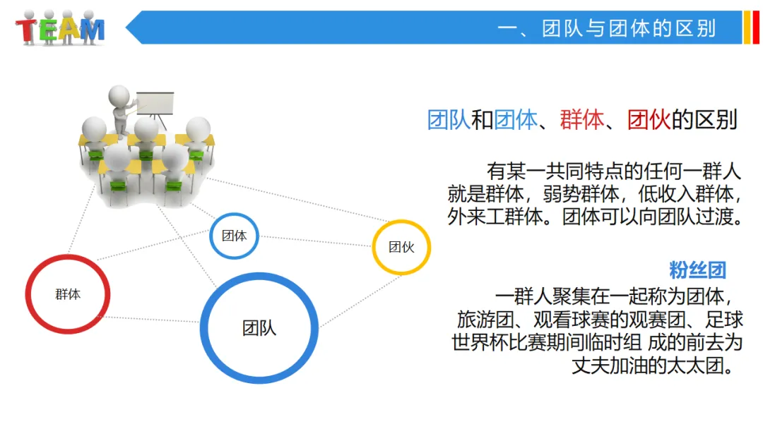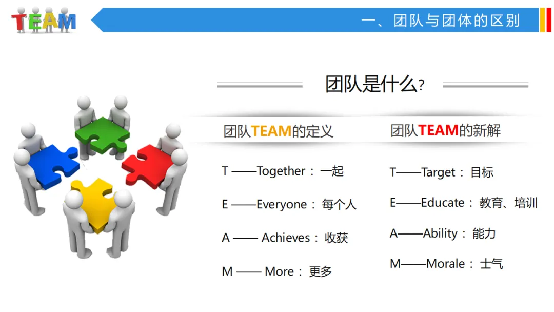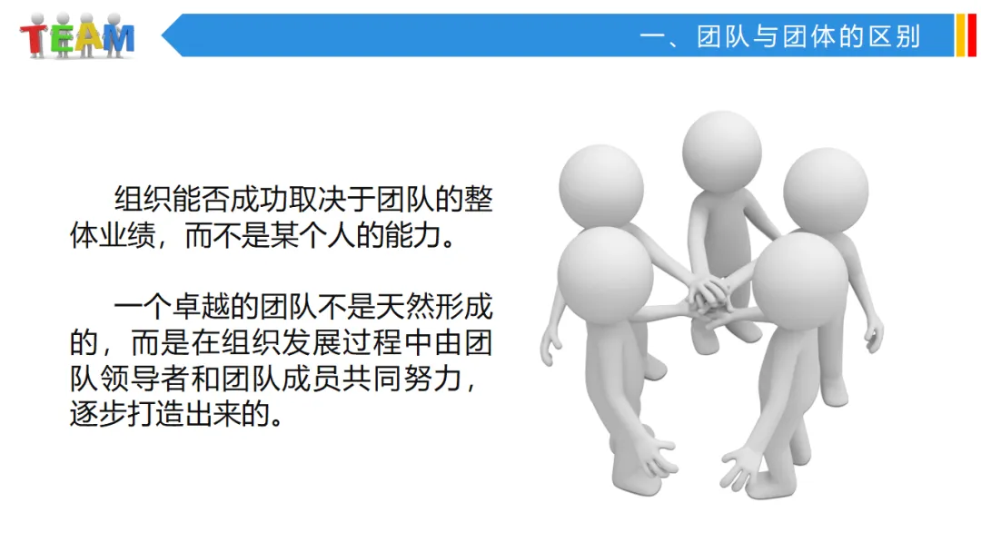 。比如,你们部门有10个人,大家每天来上班,各自完成自己的KPI,但这只是一个"工作群体",而非"团队"。真正的团队,是当这10个人心往一处想、劲往一处使,为了共同目标愿意互相补位、彼此成就时,才形成的。