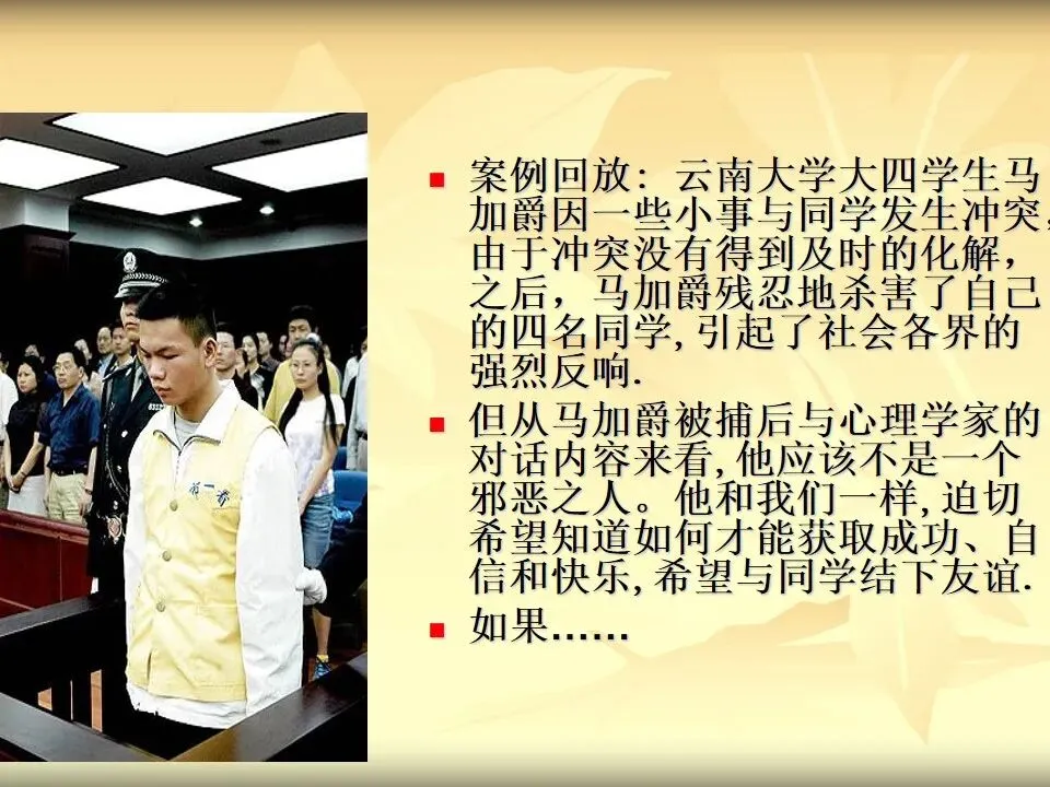 但从马加爵被捕后与心理学家的对话内容来看,他应该不是一个邪恶之人。他和我们一样,迫切希望知道如何才能获取成功、自信和快乐,希望与同学结下友谊.