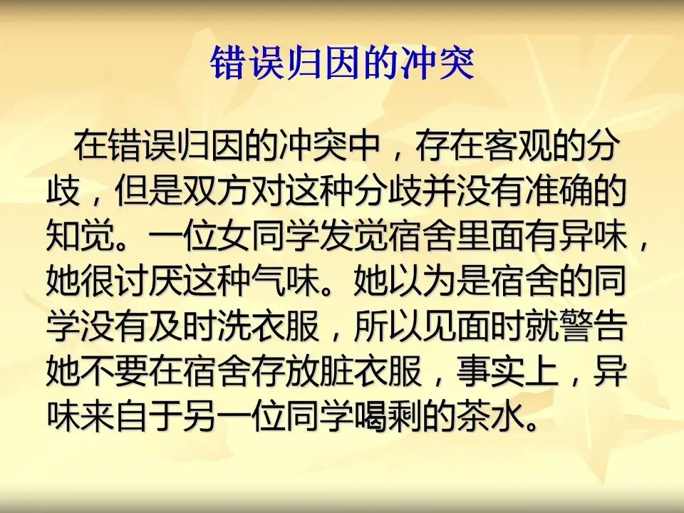 在错误归因的冲突中,存在客观的分歧,但是双方对这种分歧并没有准确的知觉。一位女同学发觉宿舍里面有异味,她很讨厌这种气味。