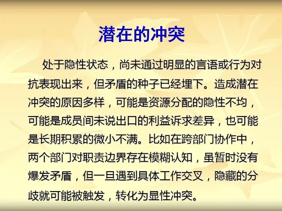 处于隐性状态,尚未通过明显的言语或行为对抗表现出来,但矛盾的种子已经埋下。造成潜在冲突的原因多样,可能是资源分配的隐性不均,可能是成员间未说出口的利益诉求差异,也可能是长期积累的微小不满。