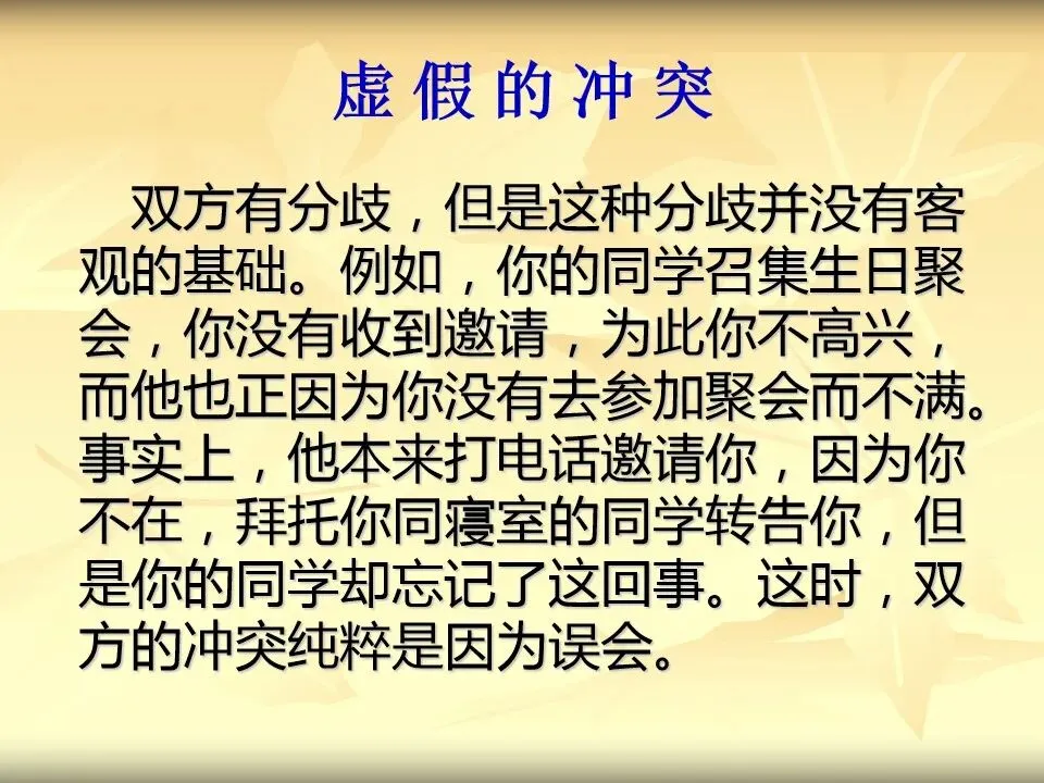 事实上,他本来打电话邀请你,因为你不在,拜托你同寝室的同学转告你,但是你的同学却忘记了这回事。这时,双方的冲突纯粹是因为误会。