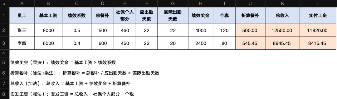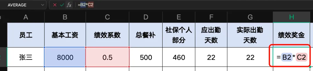 =单元格1*单元格2示例:绩效奖金(乘法):绩效奖金(H2) = 基本工资(B2) × 绩效系数(C2) ,在H2输入=B2*C2,回车即可。