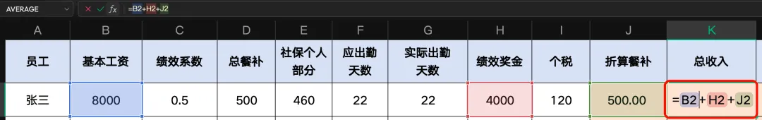=单元格1+单元格2示例:总收入(加法):总收入(K2) = 基本工资(B2) + 绩效奖金(H2) + 折算餐补(J2),在K2输入=B2-H2-J2,回车即可。