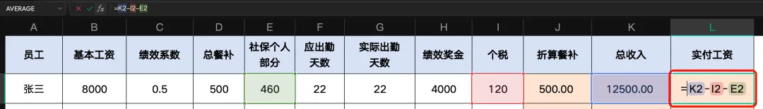 =被减数单元格-减数单元格示例:实发工资(减法):实发工资(L2)= 总收入(K2) - 社保个人部分(E2) - 个税(I2),在L2输入=K2-E2-I2,回车即可。