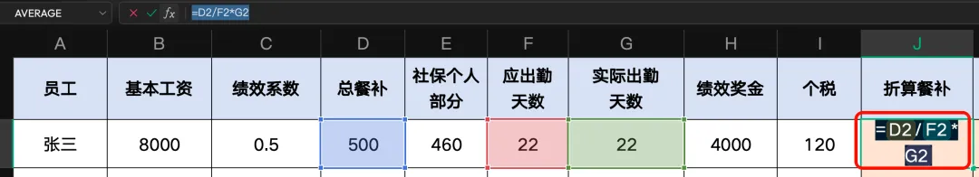 =被除数单元格/除数单元格示例:折算餐补(除法+乘法):折算餐补(J2) = 总餐补(D2) / 应出勤天(F2)数 × 实际出勤天数(G2),在J2输入=D2/F2*G2,回车即可。