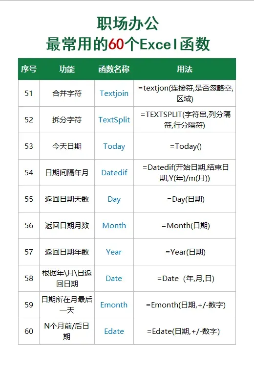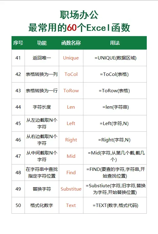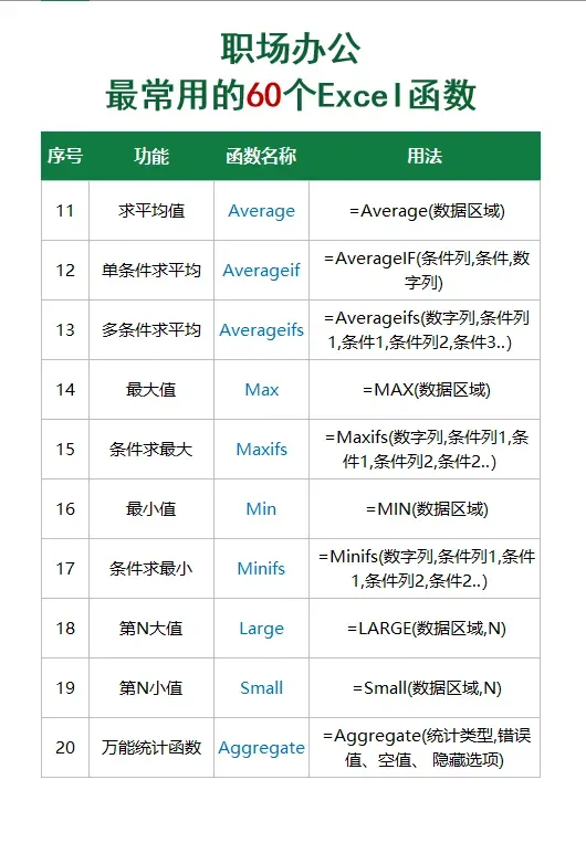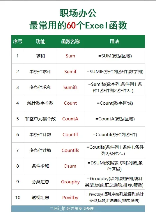Sum Average INT Vlookup UniqueTextjoinSumif Averageif Round Xlookup ToCol TextSplitSumifs Averageifs Roundup Filter ToRow TodayCount Max RoundDown Lookup Len DatedifCountA Maxifs MOD Match Left DayCountif Min IF Index Right MonthCountifs Minifs IFS Vstack Mid YearDsum Large Iferror Hstack Find DateGroupby Small And Offset Substitue EmonthPovitbyAggregateORINDIRECTTextEdate兰色注:以上函数中Groupby和pivotBy是office365新增的函数,功能超级强大,同学们可以作为重点函数学习。而dsum则属数据库函数,可以只是一次性查找,功能碾压所有求和函数。