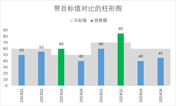 柱形图可用于对比数据差异,但如果想在柱形图中直接对比数据的同时,还想突出显示出重点数据时,常规的柱形图就无法满足你的需求,本期给大家分享在Excel中绘制带目标值对比的柱形图,如下,通过浅色的背景轮廓表达出目标值(或计划值),再使用亮色柱形来突出显示实际达成或超过目标值的数据(或类别);操作步骤: