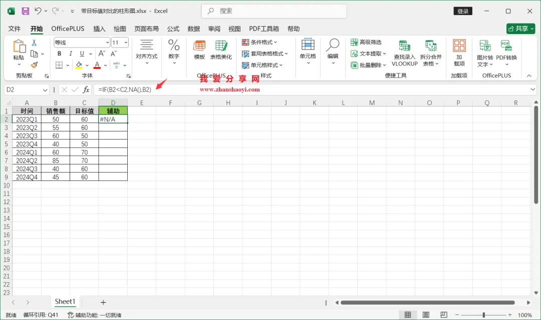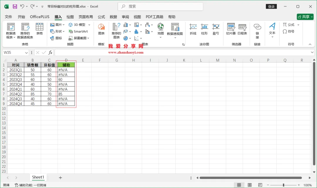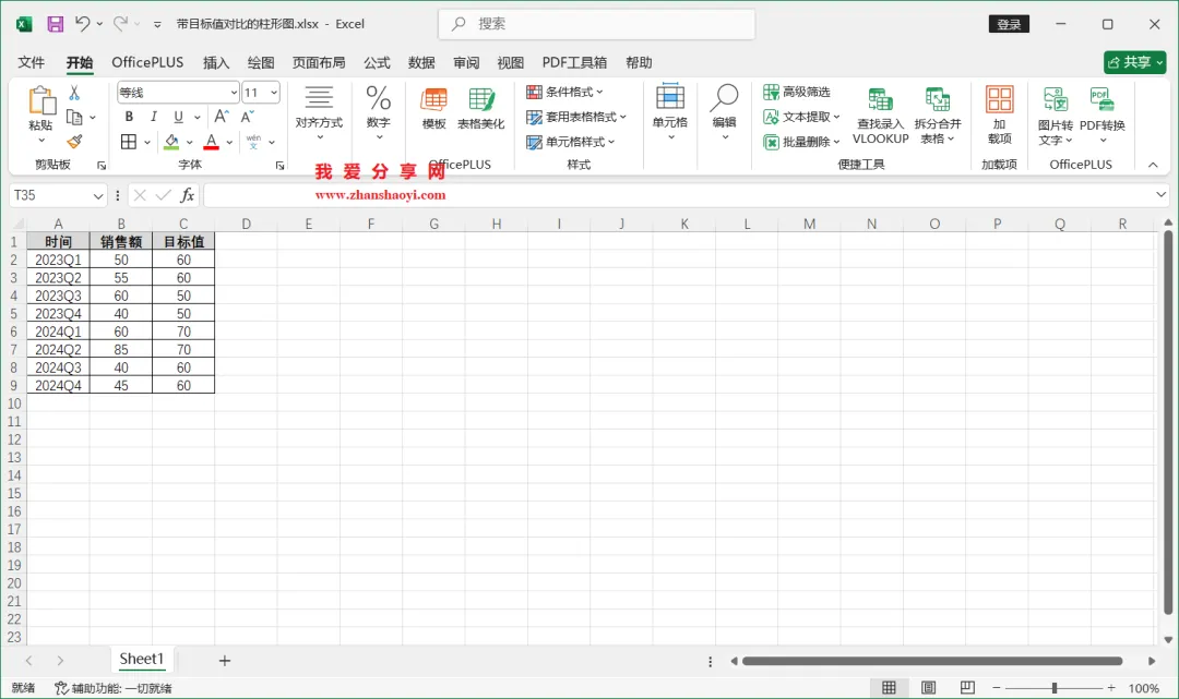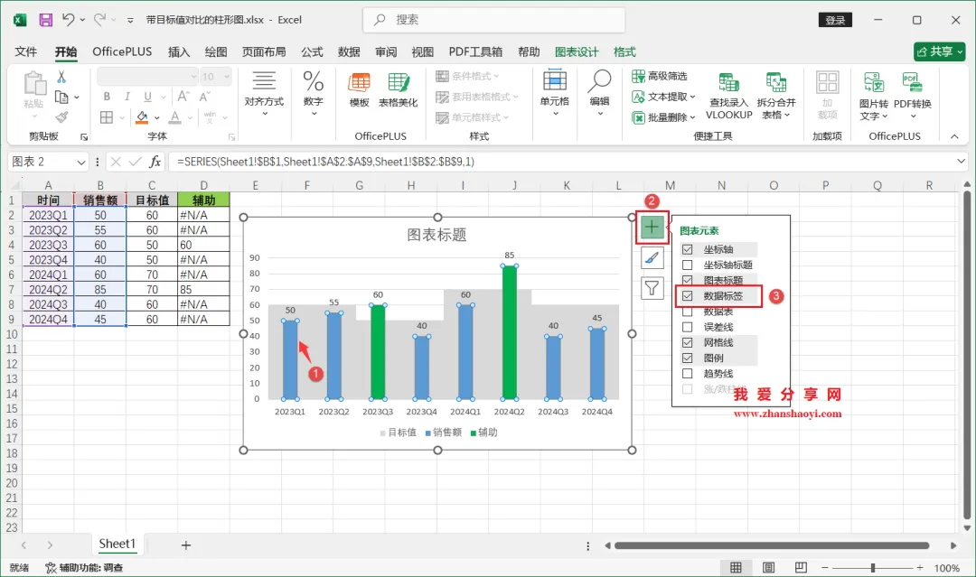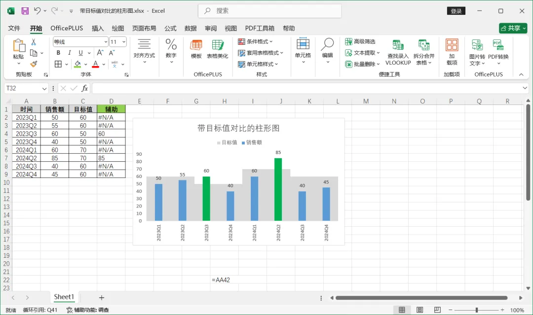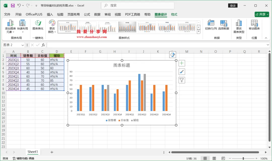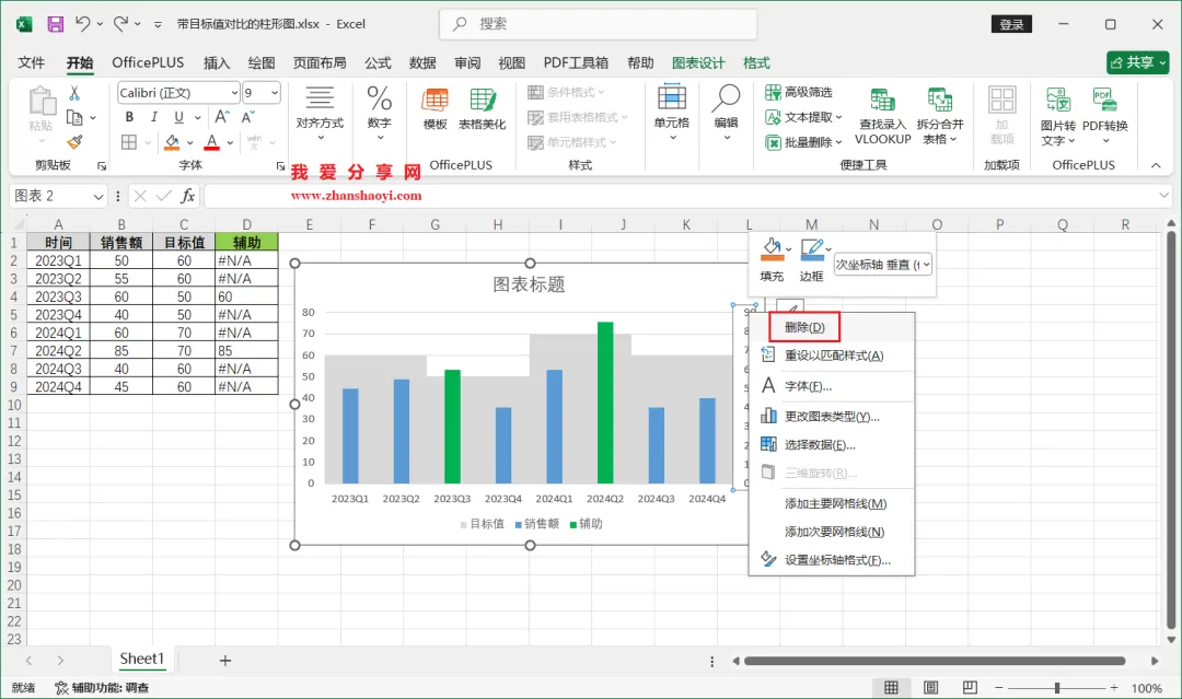 15、最后,修改标题、设置横轴刻度显示和隐藏网线线,完成带目标值对比的柱形图效果如下,希望本期分享的内容对大家有所帮助~~