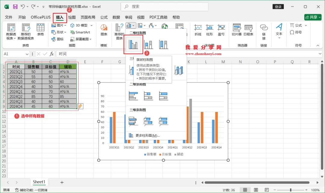 3、先选中所有数据,然后点击菜单栏中【插入】,再点击图表栏中【柱形图】按钮,在展开列表中选择【簇状柱形图】;
